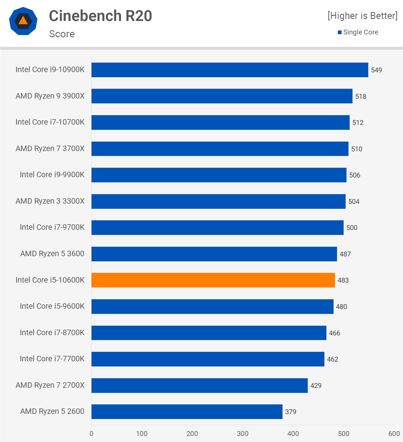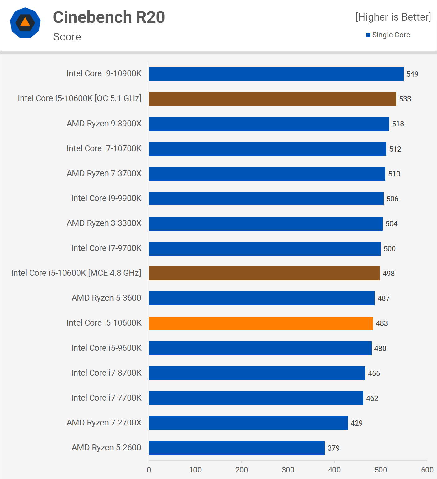 La performance monocœur était également légèrement supérieure au 8700K, ici le 10600K était 4% plus rapide et cela le rendait juste 1% plus lent que le 3600.