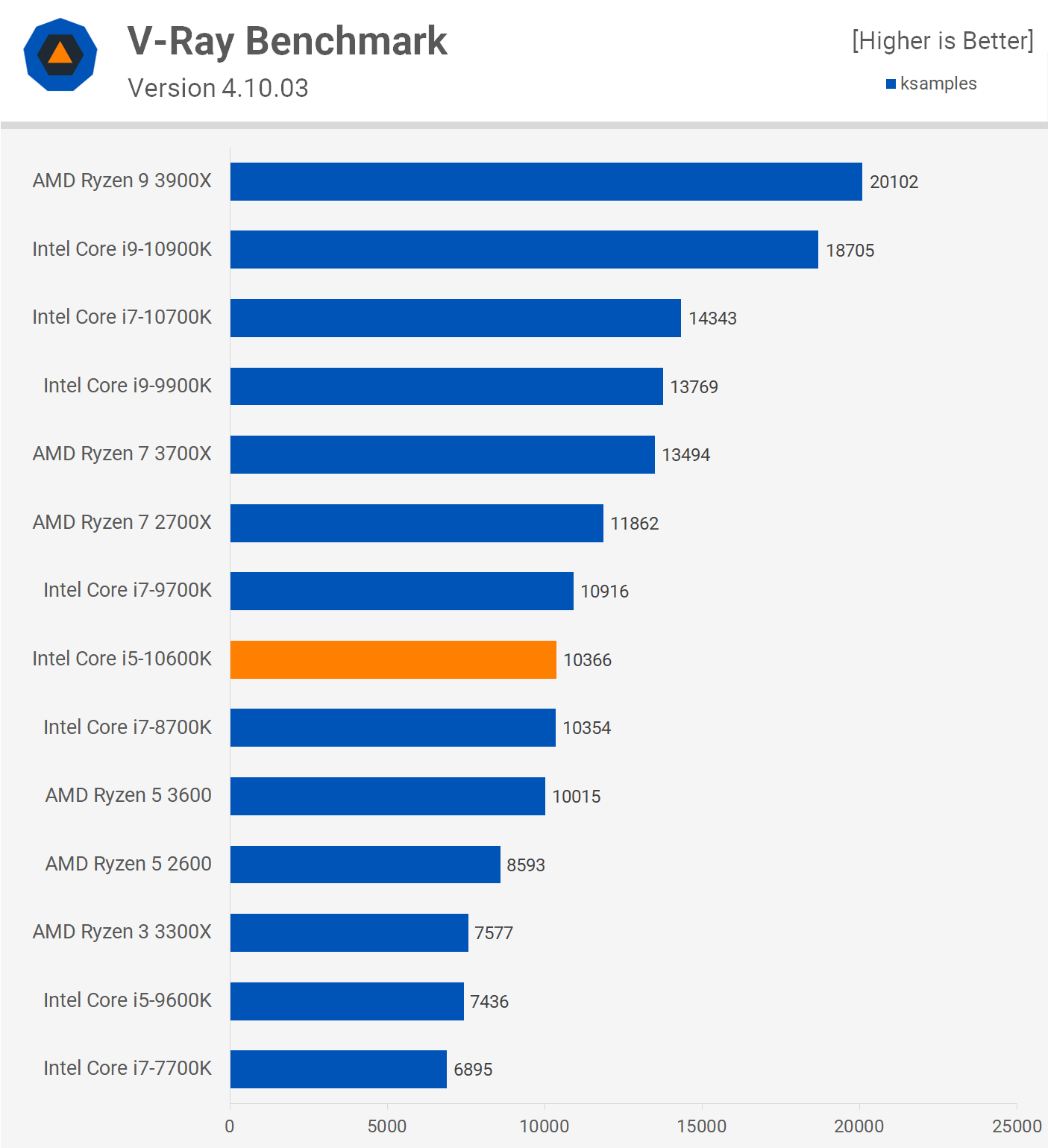 Dans l'indice de référence V-Ray, le 10600K était légèrement plus rapide que le R5 3600 mais plus de 20% plus lent que le 3700X.