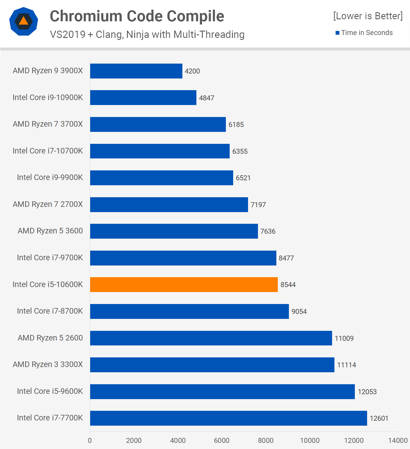 Ensuite, nous avons les performances de compilation de code. Ici, le 10600K était 6% plus rapide que le 8700K et cela lui permettait de correspondre au 9700K. C'est l'une des marges les plus importantes que nous ayons vues jusqu'à présent, mais après avoir relancé ce test sur les deux processeurs, nous nous sommes retrouvés avec les mêmes résultats. Le 10600K était toujours à 11% derrière le R5 3600 et 28% plus lent que le 3700X.