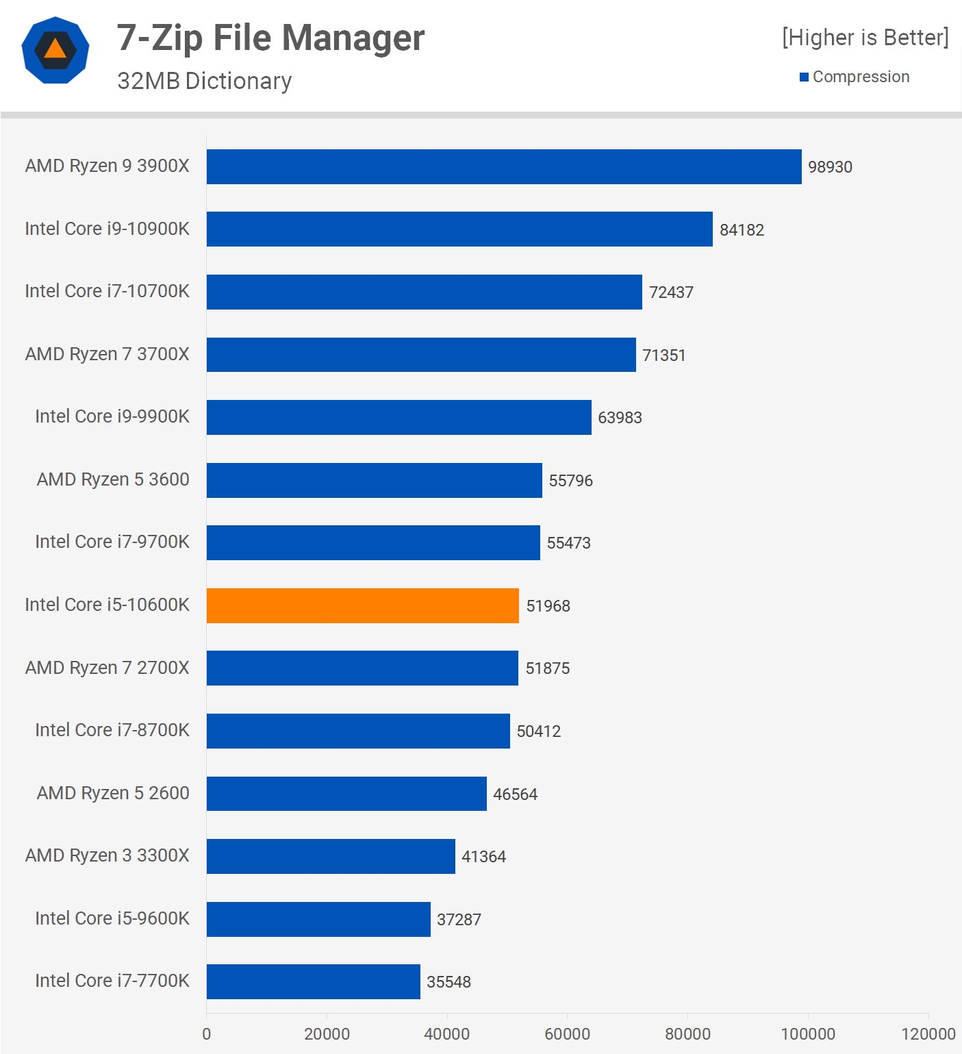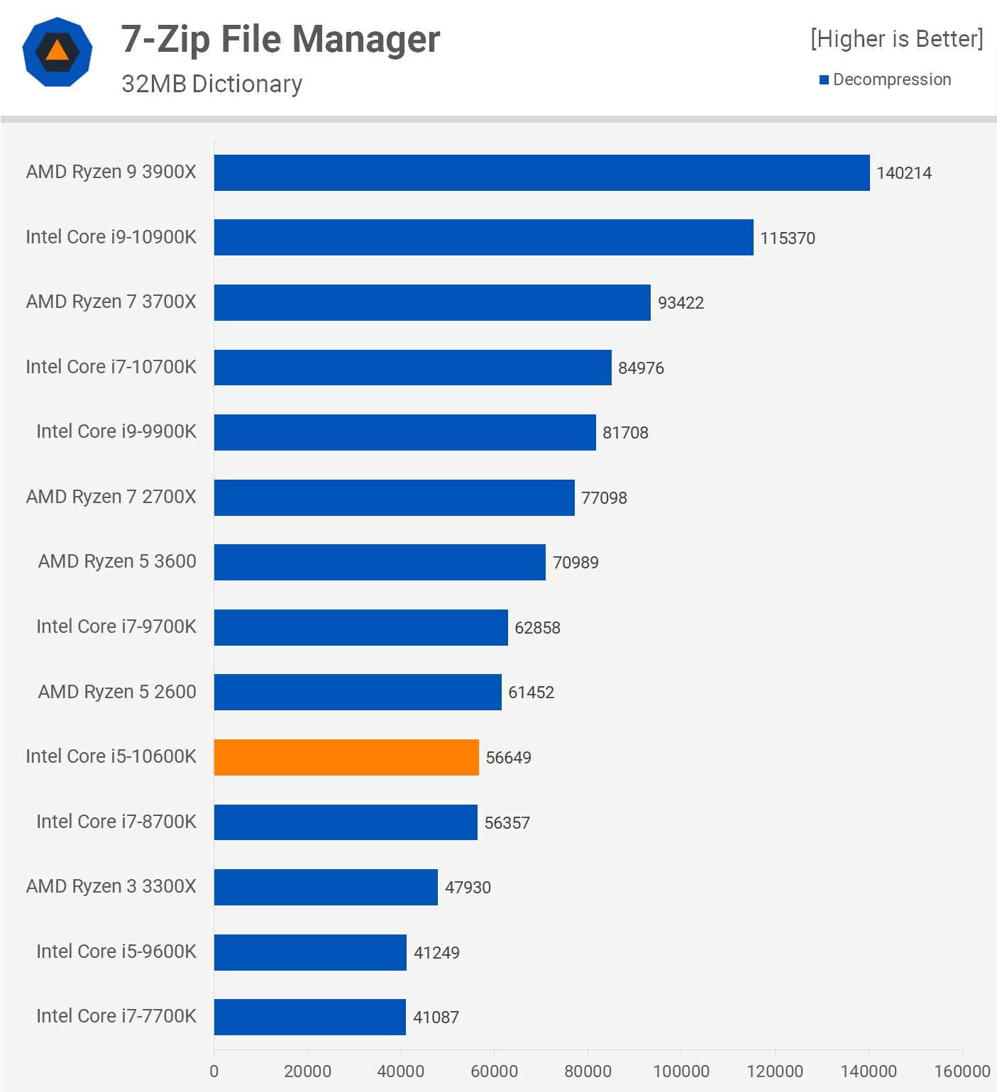 En regardant les performances de compression, nous voyons que le 10600K est très similaire au 8700K, cette fois en le battant légèrement. Il était plus lent que le Ryzen 5 3600 et un peu plus lent que le 3700X.