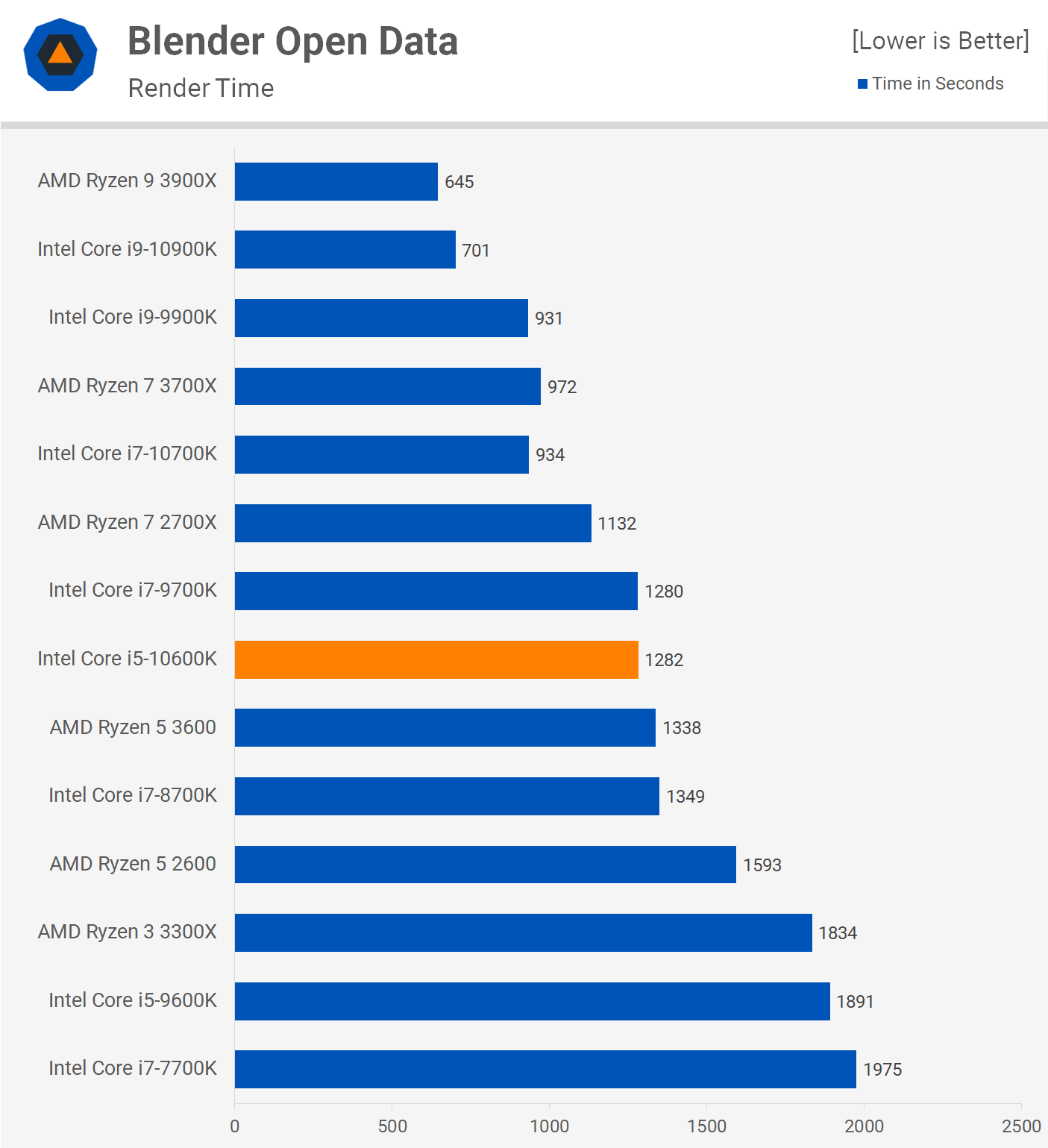 Ensuite, nous avons le benchmark Blender Open Data où le 10600K était 5% plus rapide que le 8700K, complétant le benchmark CPU en 1282 secondes. Cela signifiait qu'il était légèrement plus rapide que le Ryzen 5 3600, mais 24% plus lent que le 3700X.