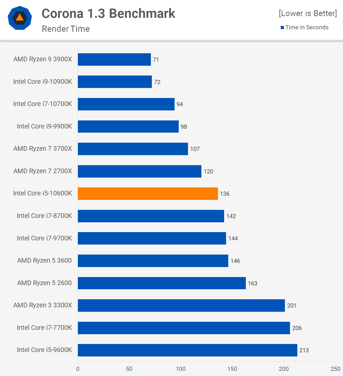 Le Core i5-10600K présente une légère amélioration des performances par rapport au 8700K du Corona Benchmark, ce qui signifie qu'il était 7% plus rapide que le 3600, mais il ne correspond pas aux 16 threads du 3700X, offrant plus de 20% de performances supplémentaires.