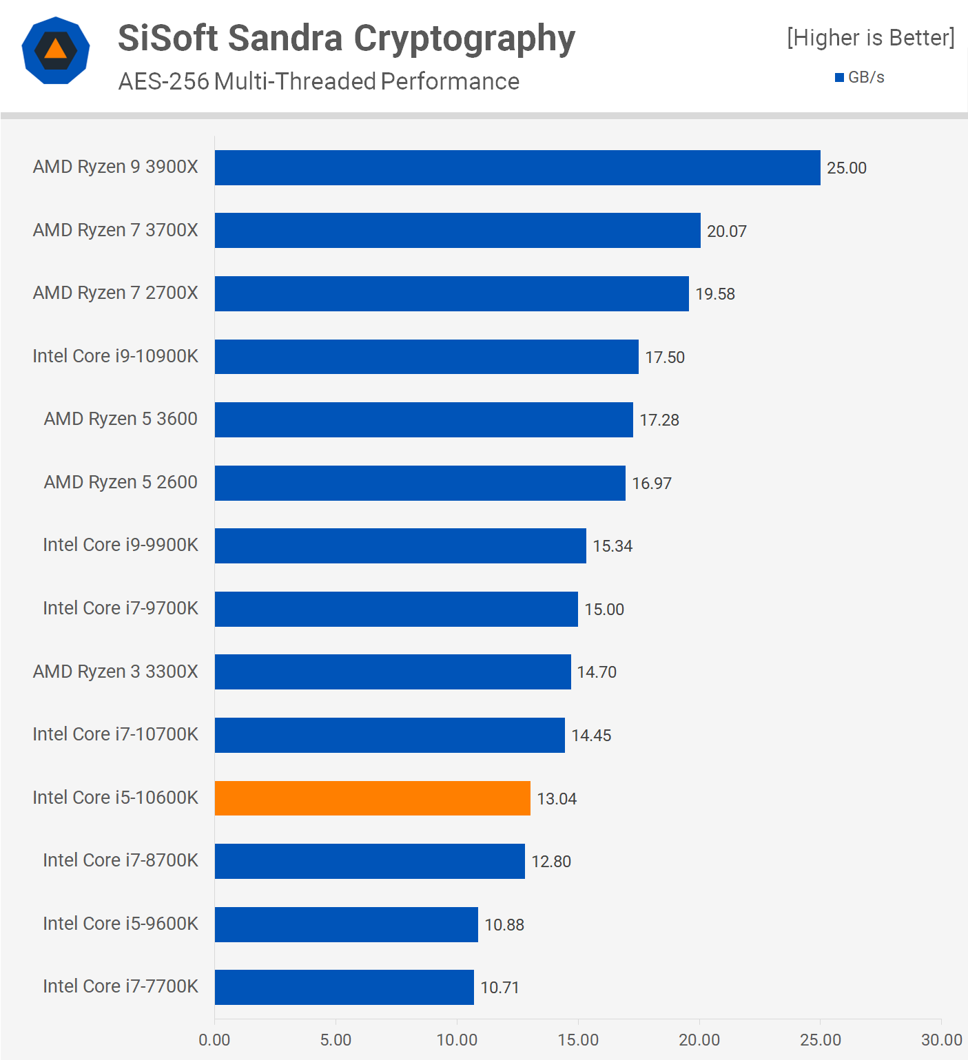 Les performances de chiffrement AES dans SiSoftware sont également très similaires à celles du 8700K, car le 10600K fournit un débit de 13 Go / s, ce qui le rend 35% plus lent que le 3700X.