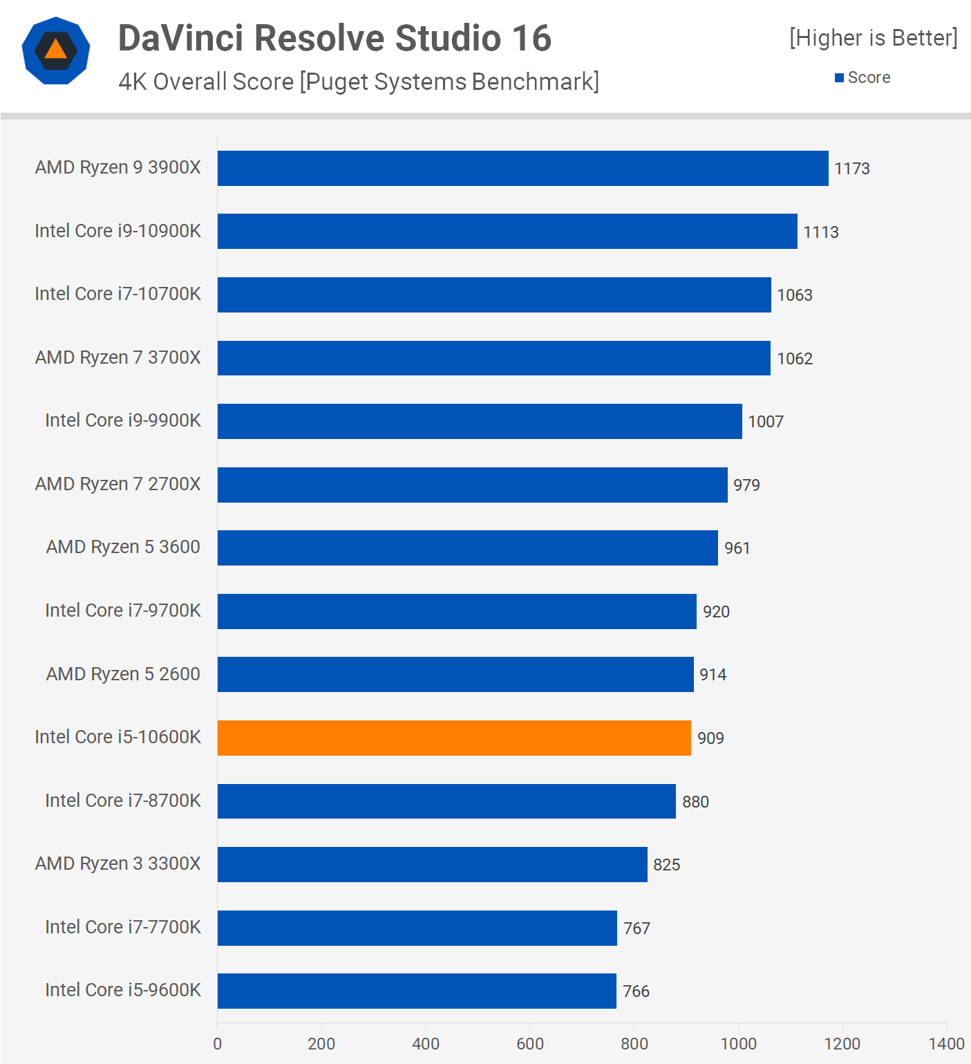 DaVinci Resolve Studio 16 voit un gain marginal pour le 10600K par rapport au 8700K et encore une fois le nouveau processeur Core i5 était plus lent que le Ryzen 5 3600, n'a réussi qu'à égaler le R5 2600.