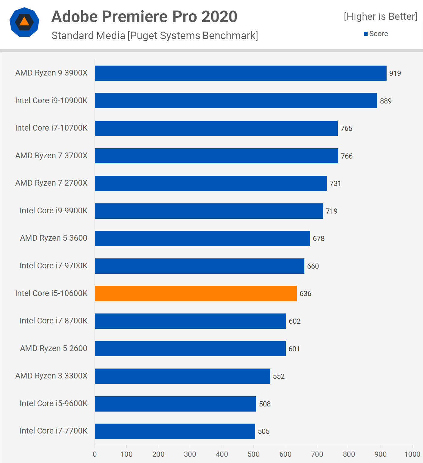 En passant aux résultats d'Adobe Premiere Pro, nous constatons que le 10600K est 6% plus rapide que le 8700K, la même marge que celle observée dans le test Chromium. Ce n'est pas une énorme différence, mais il est intéressant de voir un autre exemple reproductible où le 10600K est plus rapide avec une marge plus grande que prévu.