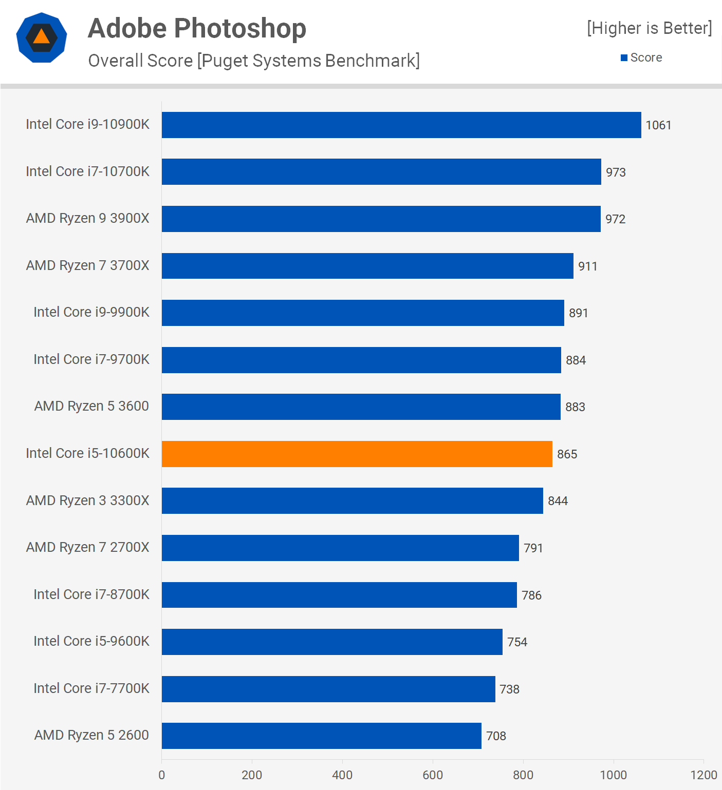 Le résultat le plus inattendu jusqu'à présent, le 10600K était 10% plus rapide que le 8700K dans Adobe Photoshop. Bien que cela l'ait toujours vu derrière le Ryzen 5 3600, c'est une marge étonnamment élevée par rapport au 8700K compte tenu de ce que nous avons vu dans d'autres applications.