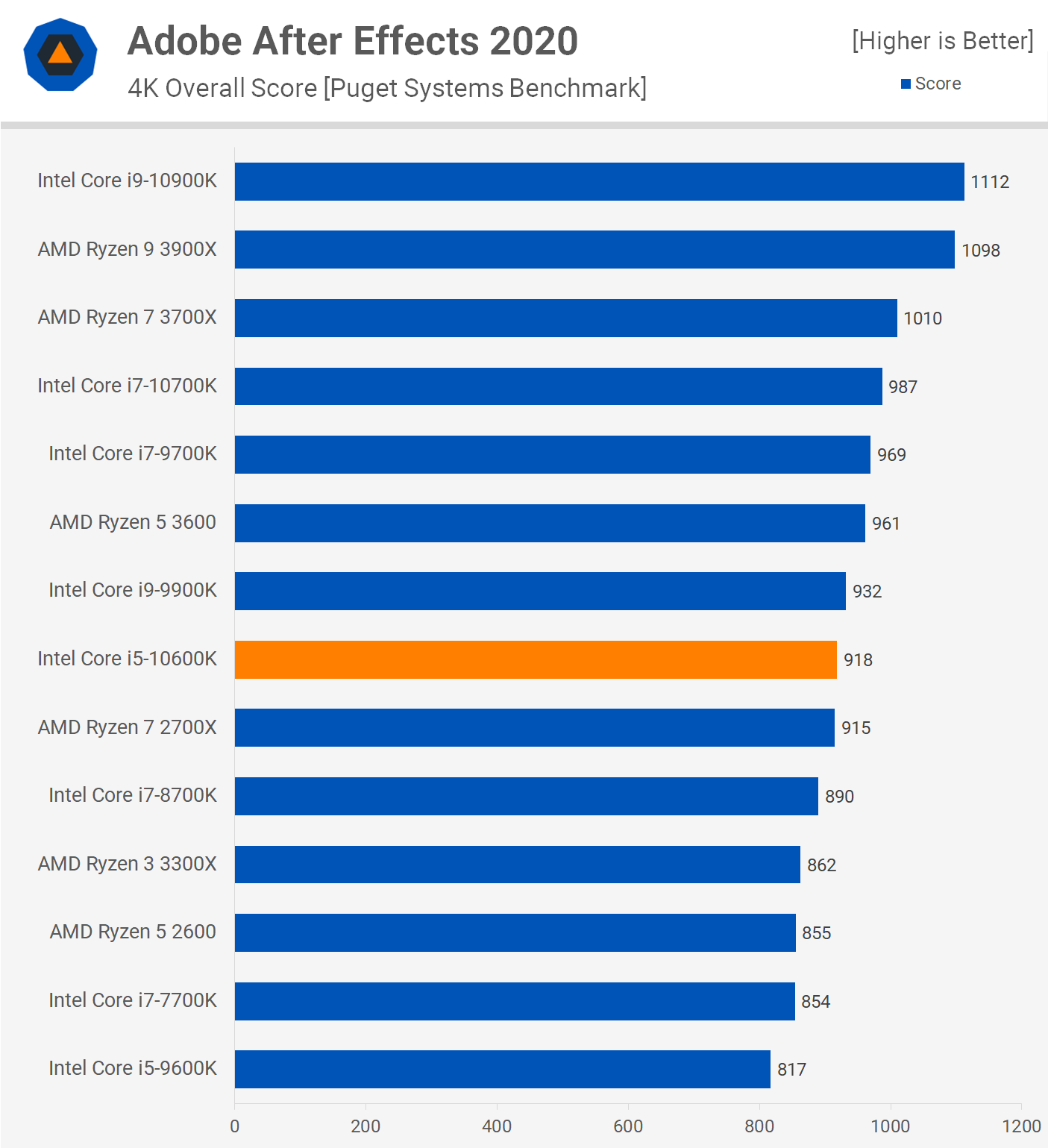 Le 10600K surpasse également le 8700K dans After Effects, mais avec une amélioration marginale de 3%. C'était suffisant pour que le nouveau processeur Core i5 dépasse le 2700X, mais pas assez pour attraper le Ryzen 5 3600.