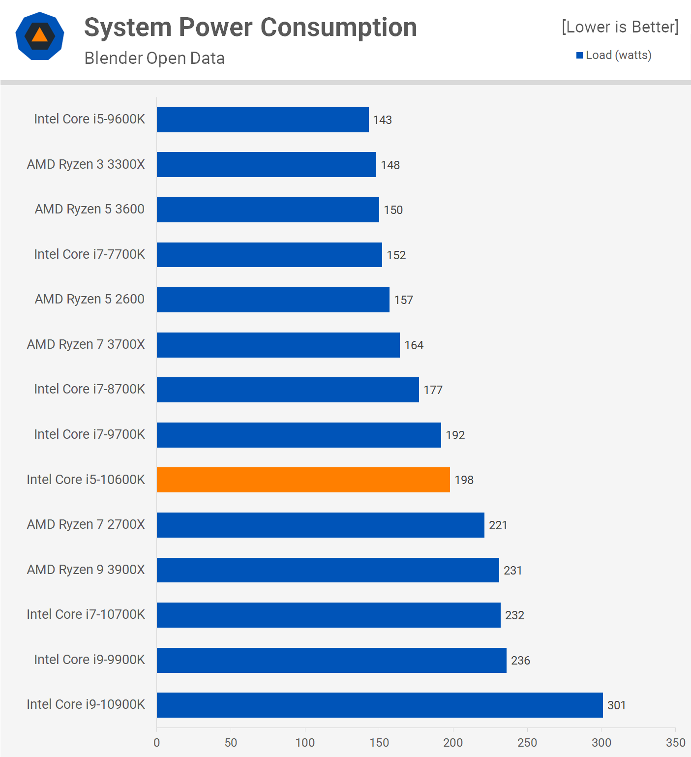 Cela va le faire pour les références de l'application, il est temps de vérifier la consommation d'énergie. Sans aucune limite de puissance en place, le Core i5-10600K a poussé l'utilisation totale du système à 198 watts, légèrement plus élevé que le 9700K et une augmentation de 12% par rapport au 8700K. Peut-être plus important encore, l'utilisation totale du système était 21% plus élevée que le 3700X et 32% de plus que le 3600, bien qu'il n'ait battu le processeur Ryzen 5 que de 4% dans ce test.