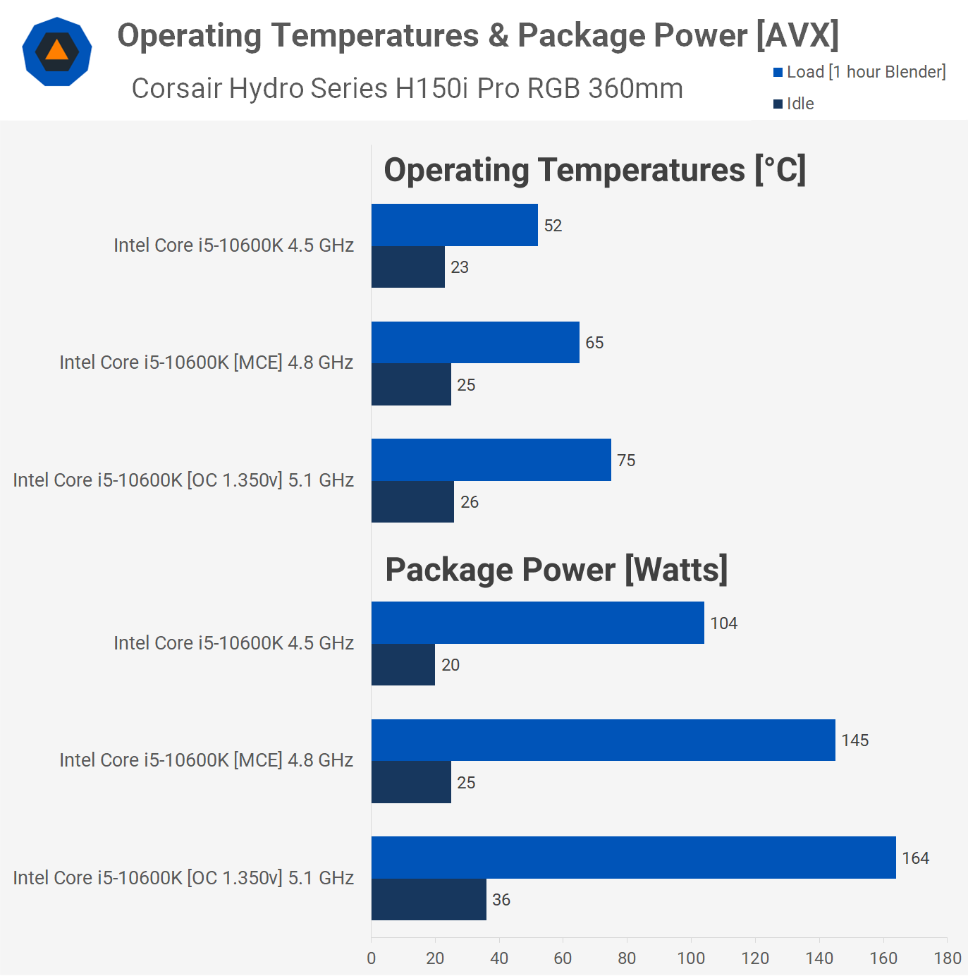 En stock, le Corsair H150i Pro a gardé le 10600K à seulement 52 C et ici, nous envisageons une puissance de seulement 104 watts. L'activation du MCE a poussé la température de fonctionnement maximale à 65 ° C, car nous voyons une augmentation de 45% de la puissance du boîtier à 145 watts. Ensuite, avec notre overclock manuel, le 10600K a atteint 75 ° C, ce qui est toujours très cool par tous les comptes. C'est une augmentation de température assez importante pour seulement une augmentation de puissance de 13 watts, mais bien sûr, ce truc évolue de manière linéaire.