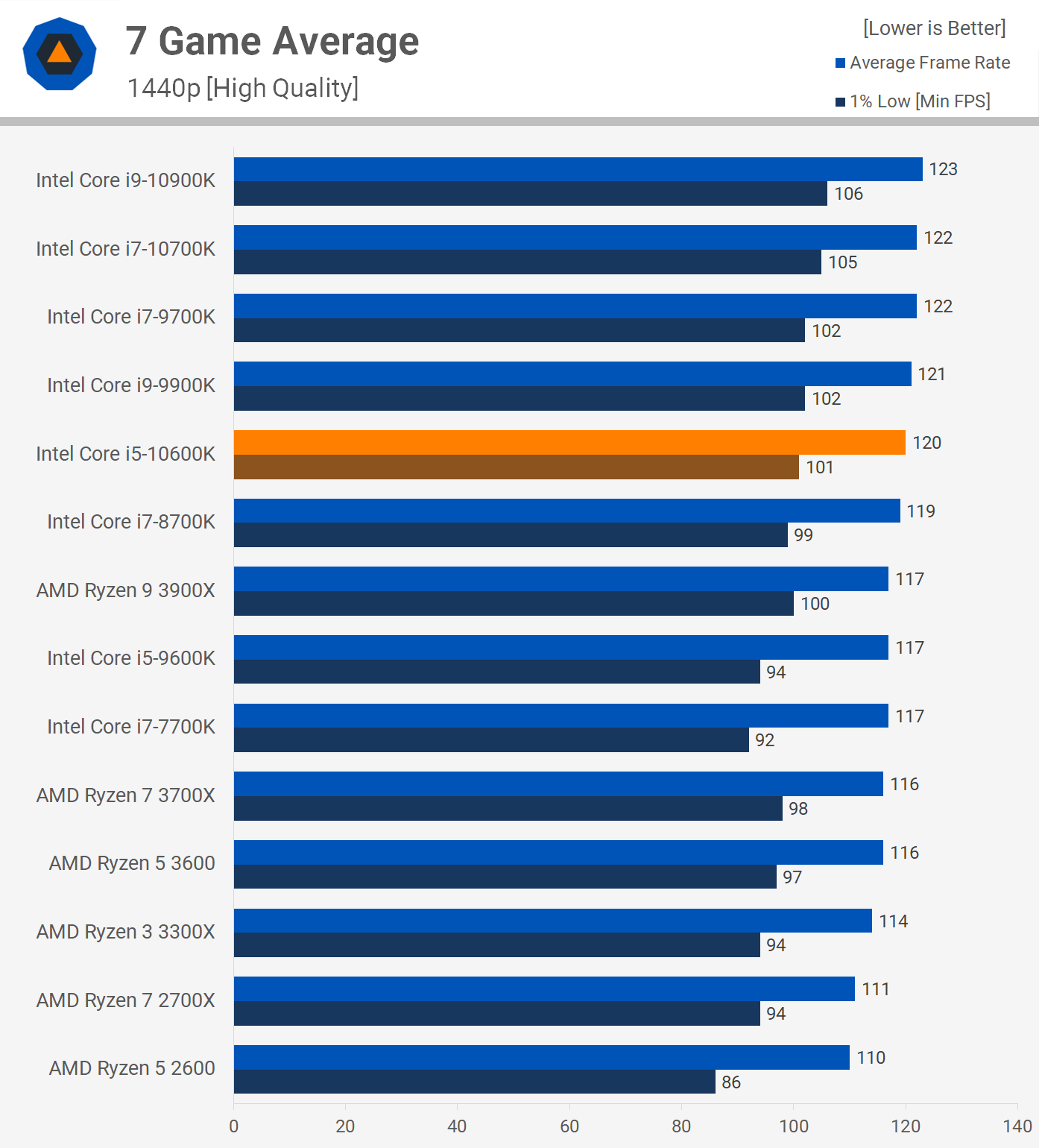 La performance à 1440p est à nouveau solide, bien que, comme prévu, les marges se rapprochent, mais le 10600K est toujours 8% plus rapide que le 3700X.