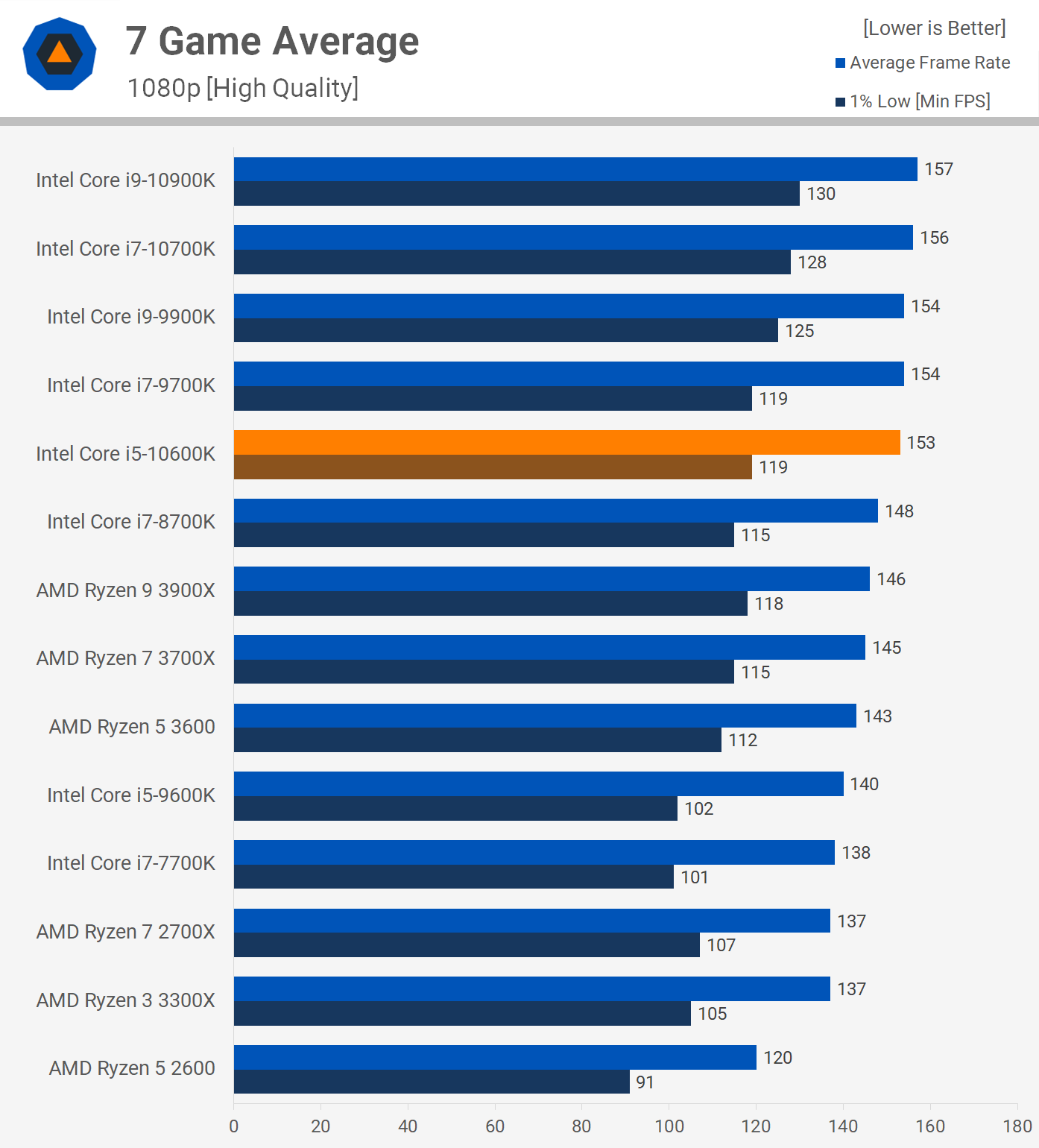 Quoi qu'il en soit, en termes de performances, le 10600K est très similaire au 8700K et cela signifie que bien qu'il puisse correspondre à la fréquence d'images moyenne des 9900K, 10700K et 10900K, il était environ 8% plus lent en regardant les données faibles de 1%.