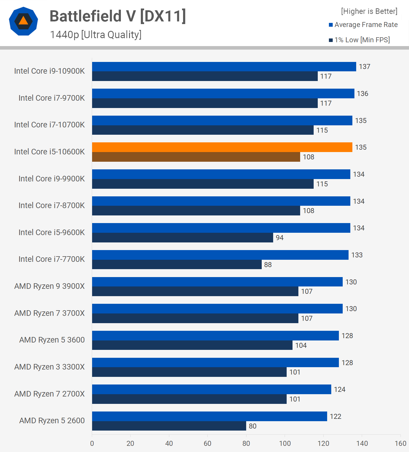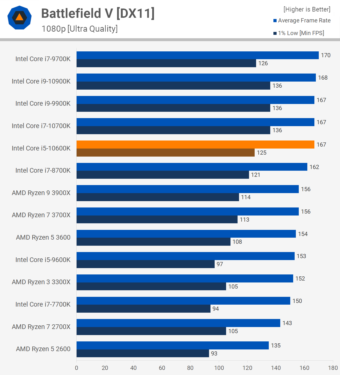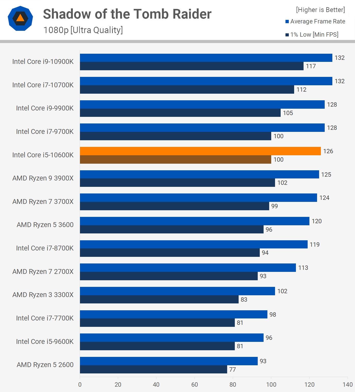 Comparé à Ryzen, il était 11% plus rapide que le Ryzen 7 3700X à 1080p, ce qui est une amélioration des performances raisonnable. Cela dit, si vous prévoyez de jouer à 1440p avec une RTX 2080 Ti ou peut-être 1080p avec une carte graphique bas de gamme, la différence entre les 10600K et 3700X sera très petite. Dans ce cas, le processeur Intel était juste 1% plus rapide ou 1fps plus rapide lors de la comparaison de 1% de données faibles et 4% plus rapide lors de la comparaison de la fréquence d'images moyenne.