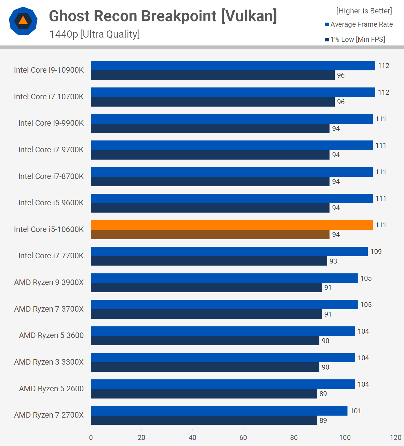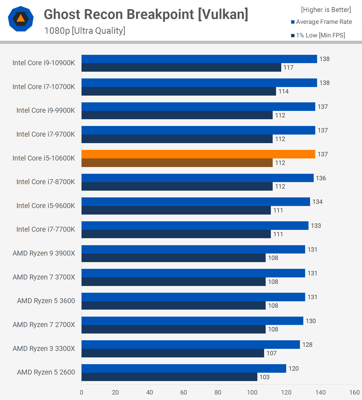 Ghost Recon Breakpoint est un titre très limité en GPU, même en 1080p avec le puissant RTX 2080 Ti. En conséquence, le 10600K était juste quelques images plus lent que le 10700K et le 10900K, alors qu'il battait le 3700X d'une marge de 5%.