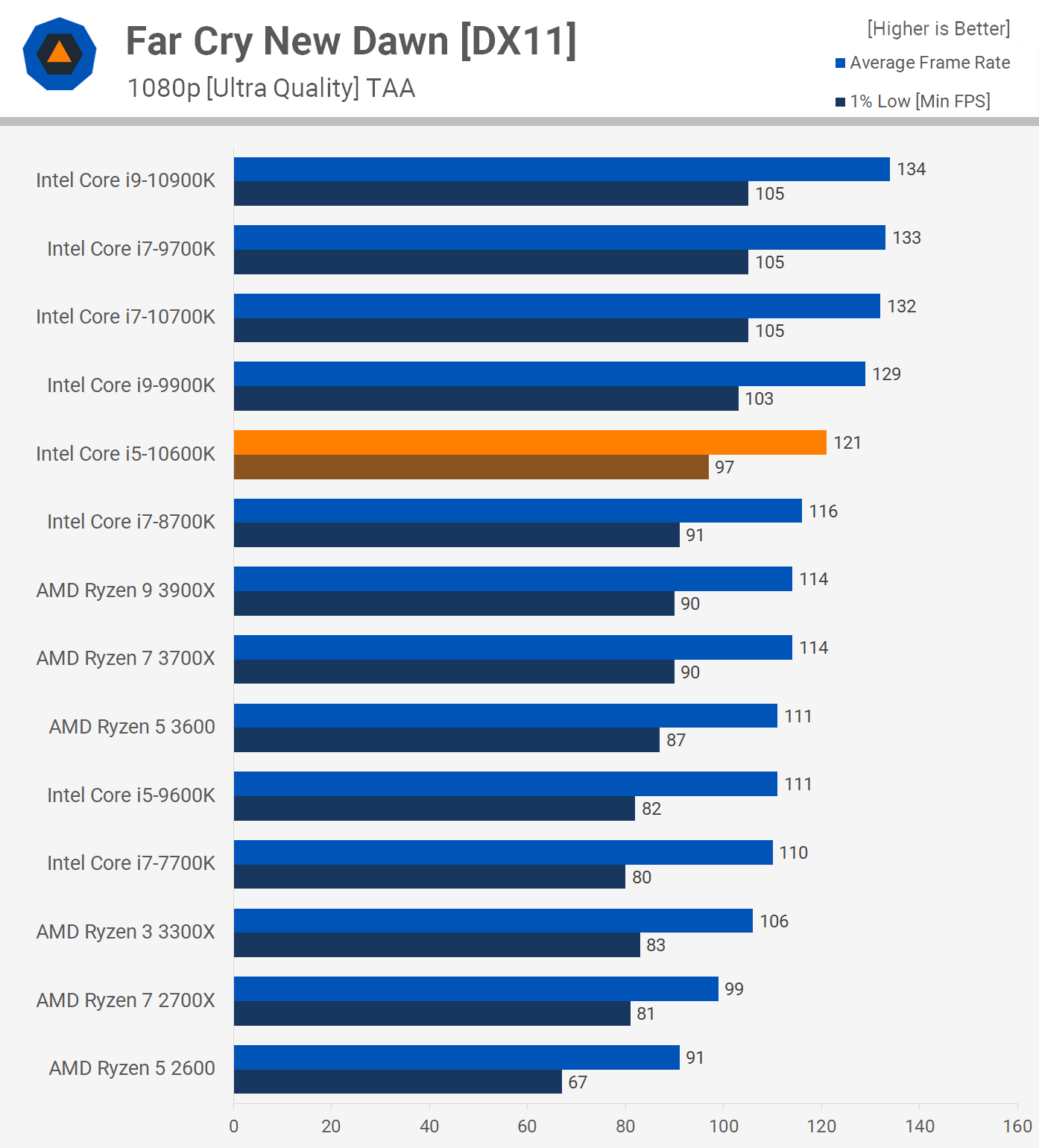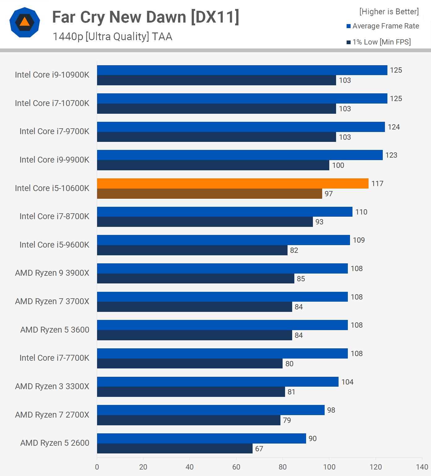 Les tests avec Far Cry New Dawn ont permis au 10600K de délivrer 121 fps en moyenne, ce qui le rendait 8% plus lent que le 10700K, mais 4% plus rapide que le 8700K. Ensuite, par rapport aux pièces Ryzen concurrentes, il était 6% plus rapide que le 3700X et 9% plus rapide que le 3600.