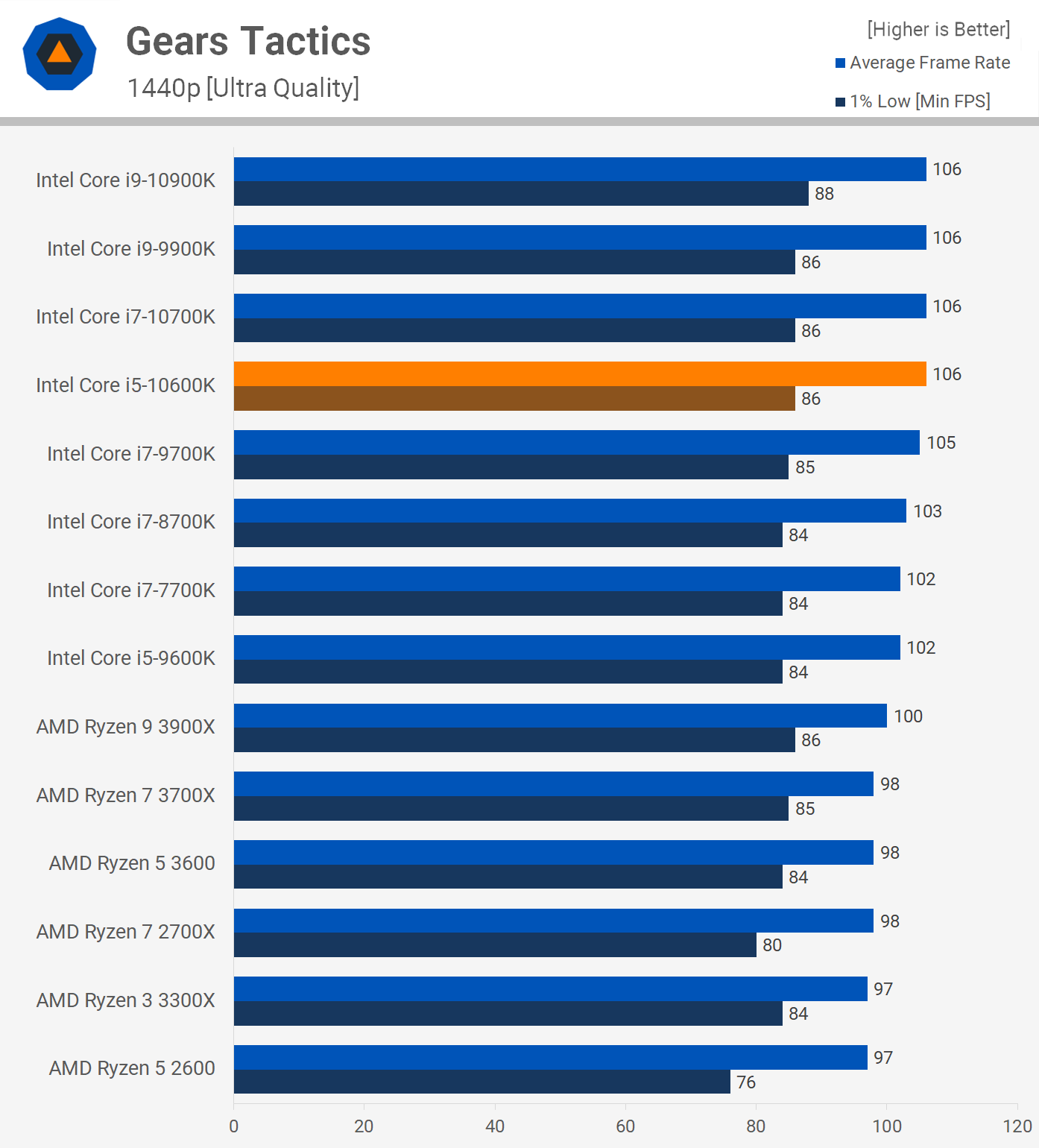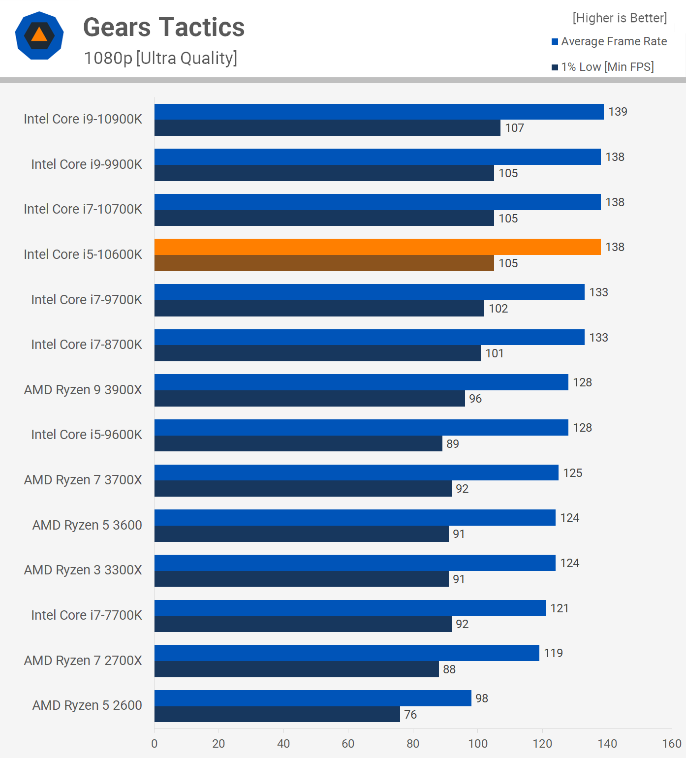 En passant aux Gears Tactics, nous voyons qu'à 1080p, en utilisant un RTX 2080 Ti, le 10600K est capable de correspondre au 10700K, le plaçant à 1-2 images par seconde du 10900K. Cela le rendait 4% plus rapide que le 8700K et 10% plus rapide que le 3700X, donc un résultat très solide ici pour le nouveau processeur Intel à 6 cœurs.
