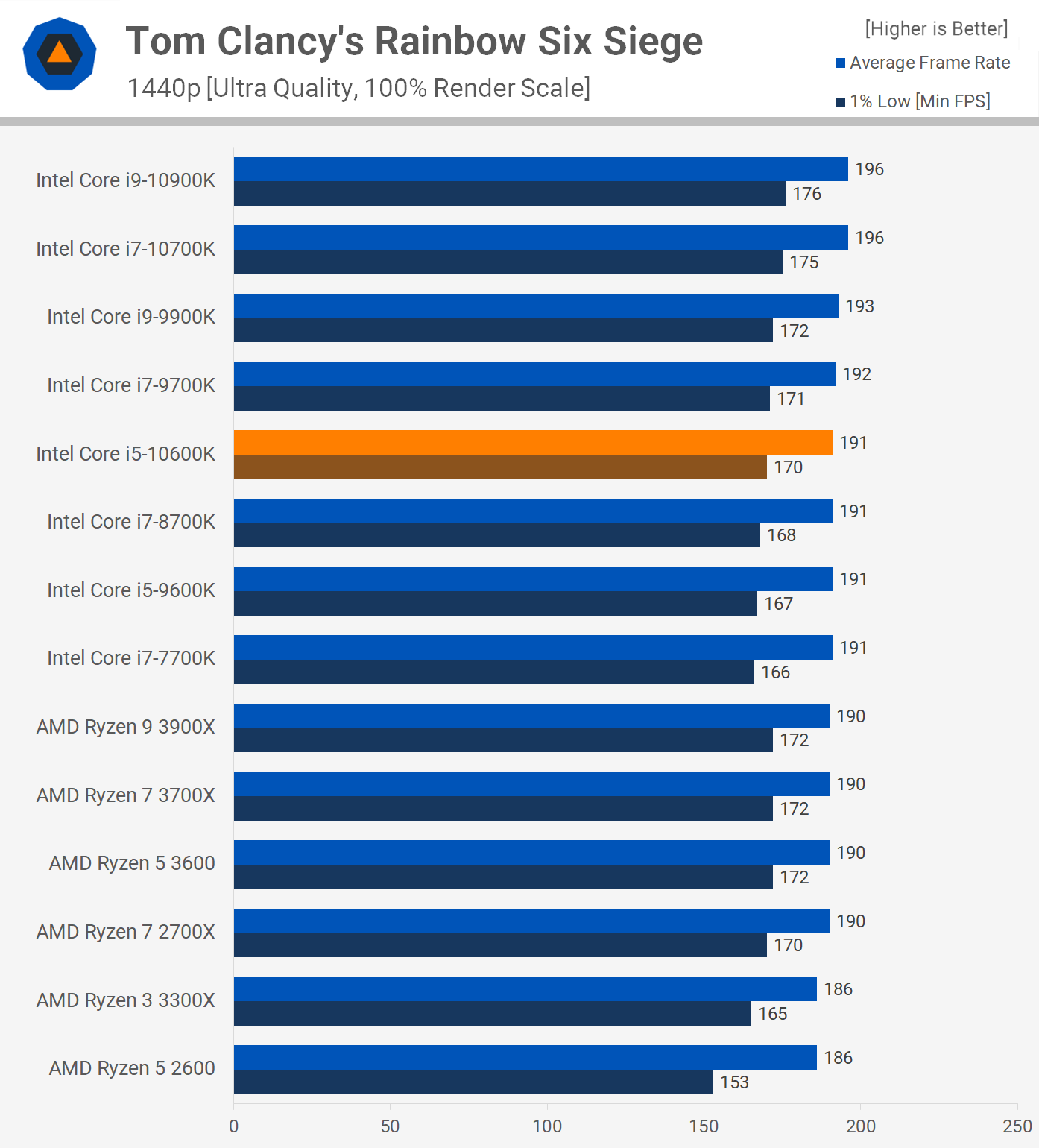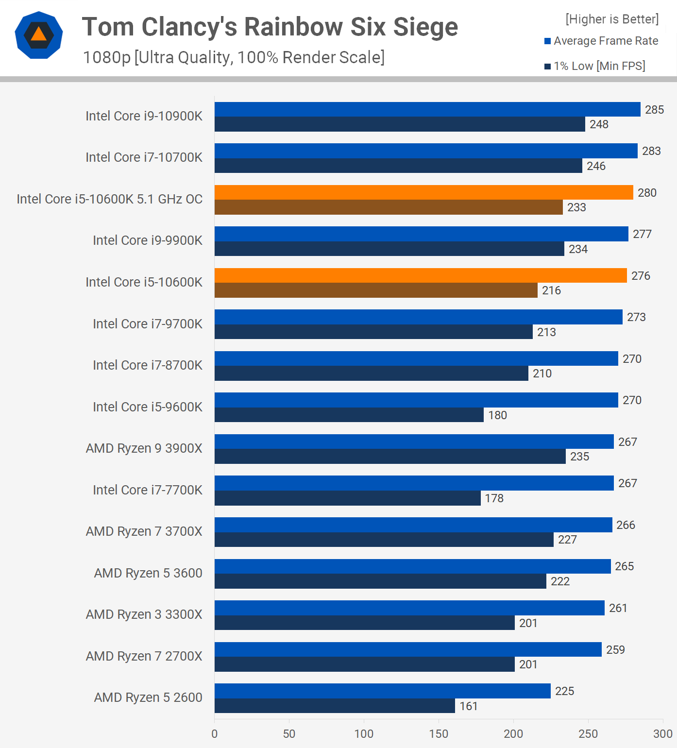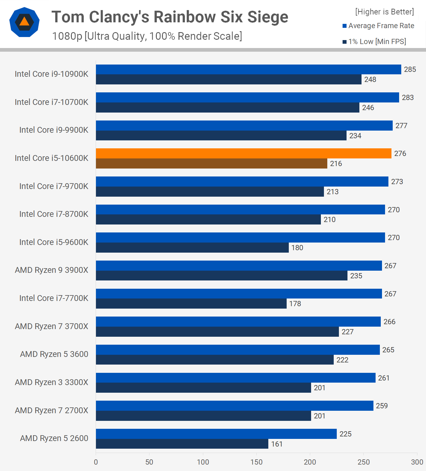 Le Rainbow Six Siege de Tom Clancy a vu le 10600K fournir 276 ips en moyenne, ce qui est comparable aux performances permises par le 10700K et le 10900K. Il y a une différence assez importante dans les faibles performances de 1%, car le Core i5 était 12% plus lent que le 10700K. De plus, par rapport au 3700X, le 10600K aurait pu fournir une fréquence d'images moyenne plus élevée, mais il était légèrement plus lent lors de la comparaison de 1% de faibles performances.