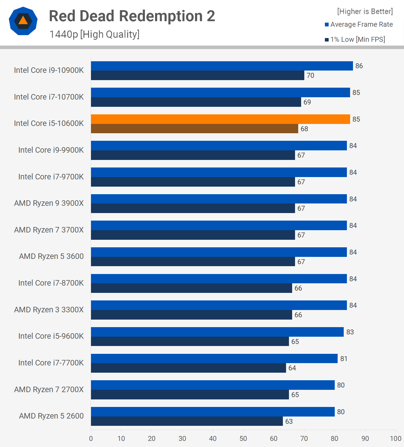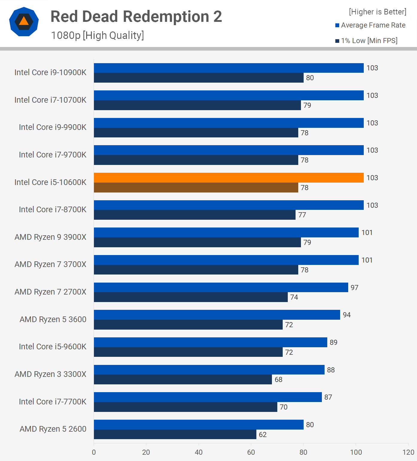 Red Dead Redemption 2 est un autre titre fortement lié au GPU, même avec les paramètres de haute qualité composés à 1080p. Ici, le 10600K a pu égaler le taux de trame moyen des 10700K et 10900K et juste légèrement en retard sur le faible résultat de 1%.