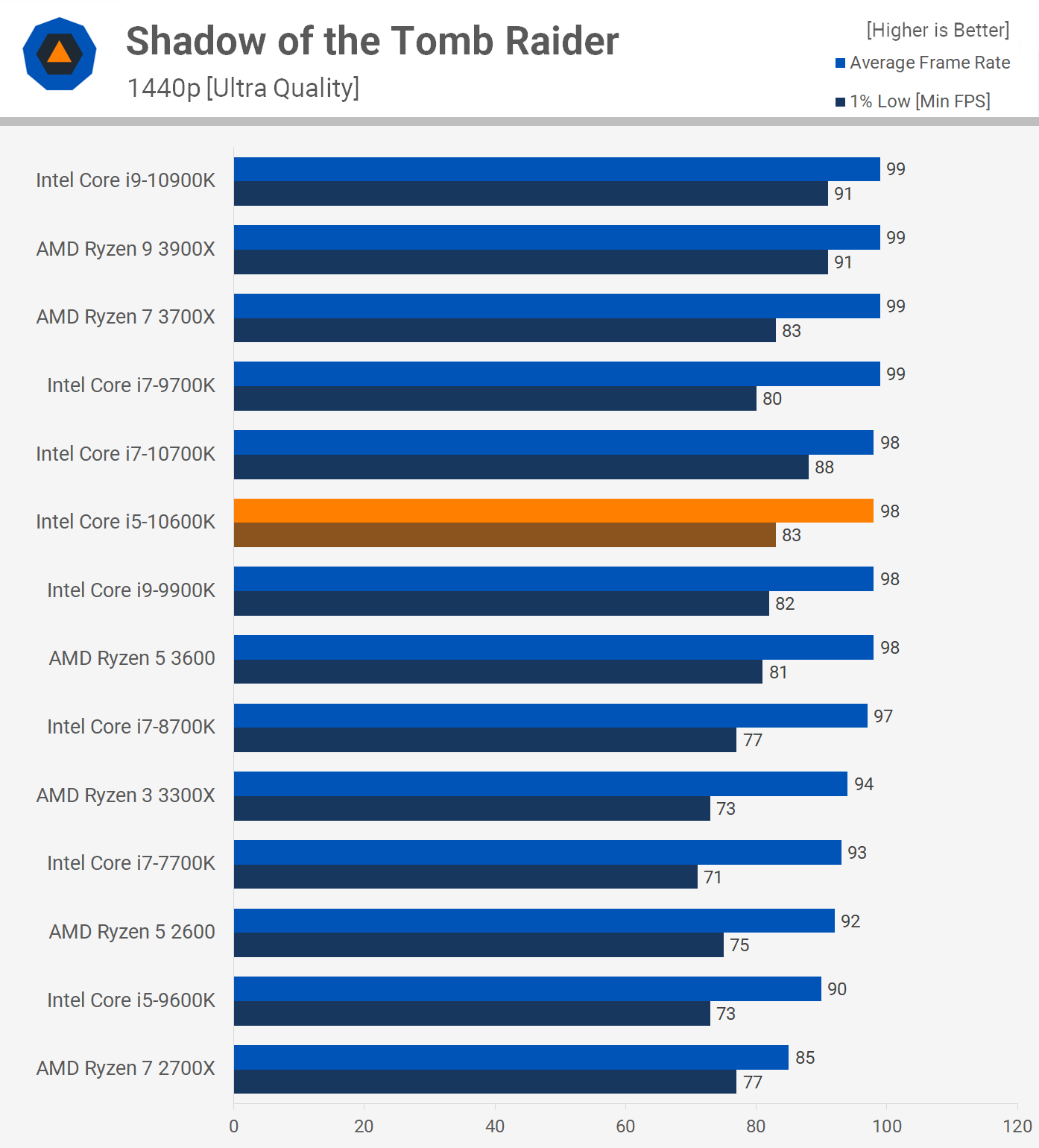 Ensuite, nous avons Shadow of the Tomb Raider et ici le 10600K était jusqu'à 6% plus rapide que le 8700K et cela signifiait qu'il était 2% plus rapide que le 3700X, il était 5% plus lent que le 10700K en comparant la fréquence d'images moyenne et 11% plus lent lors de la comparaison de 1% de données faibles.