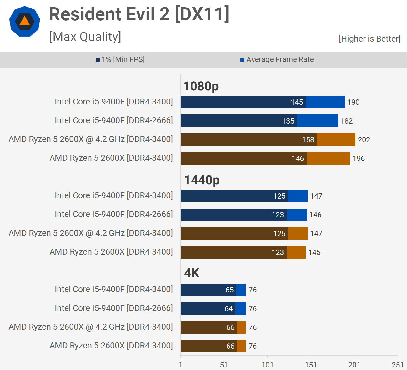 Si, pour une raison quelconque, vous recherchez une cadence élevée dans Resident Evil 2, il semble que le Ryzen 5 2600X soit le processeur à utiliser, du moins sur le Core i5-9400F. Avec une résolution de 1080p dans sa configuration de base, le 2600X était 8% plus rapide et 6% plus rapide une fois optimisé pour optimiser les performances.
