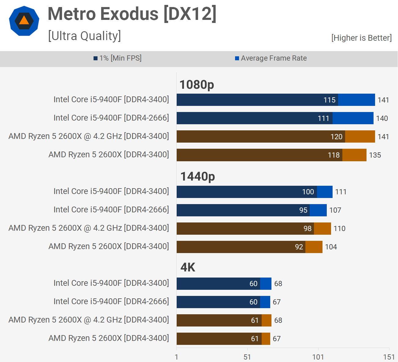 La performance dans Metro Exodus était compétitive et il n'y avait pas de distinction entre les deux processeurs. Ce n’est pas le jeu le plus exigeant en matière de CPU, mais c’était bien de voir le 2600X assortir le 9400F à ce titre moderne.