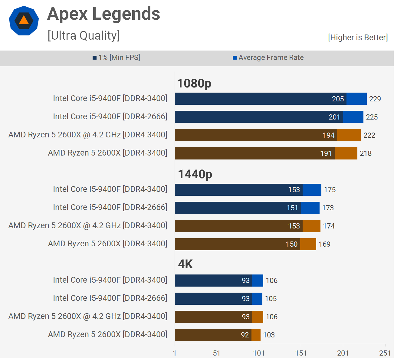 Le 9400F était également plus rapide dans Apex Legends. Rien ne vaut toutefois la peine de nous enthousiasmer trop. En fait, nous visons exactement la même expérience en utilisant l’un ou l’autre du processeur.