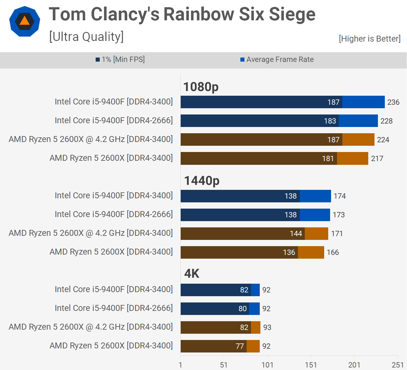 Le Core i5-9400F avance légèrement en 1080p dans Rainbow Six Siege en termes de fréquence de trame moyenne, mais les valeurs basses de 1% sont toutes très similaires. Il y a très peu de différence entre ces deux processeurs à 1080p et pratiquement aucune différence à 1440p et 4K.