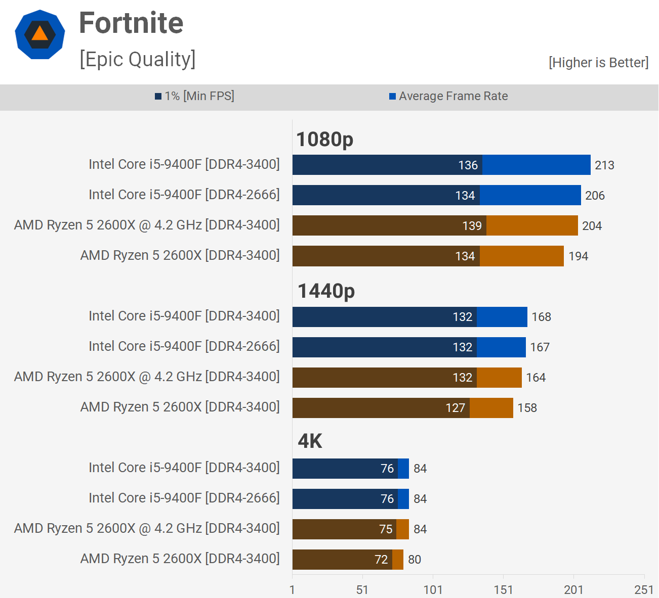 Le Core i5-9400F était un peu plus percutant dans Fortnite, mais dans l’ensemble, les marges étaient insignifiantes. Les configurations les plus rapides étaient séparées de 4% à 1080p. Naturellement, cette marge a encore été réduite à 1440p, puis à 4K, nous nous sommes retrouvés dans une impasse.