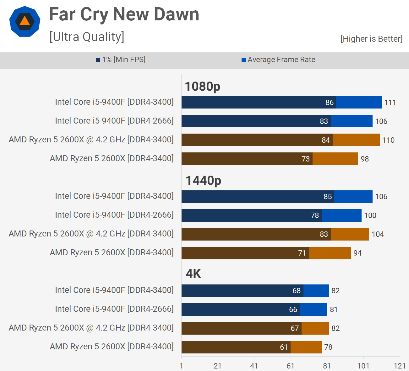 Voici un autre exemple où le 9400F était plus rapide par une petite marge. Lors des tests avec Just Cause 4, le processeur Intel était jusqu’à 8% plus rapide lorsqu’on comparait des configurations similaires, ce qui signifie que les résultats, qui sont inférieurs à 1%, étaient sensiblement identiques.