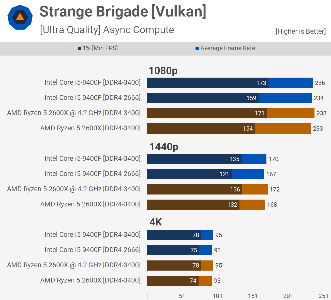 Strange Brigade ne nécessite pas beaucoup de ressources en processeur, mais il est très bien optimisé et nous permet de tester à l’aide de l’API Vulkan. Globalement, les deux processeurs ont bien exploité le RTX 2080 Ti à chaque résolution.