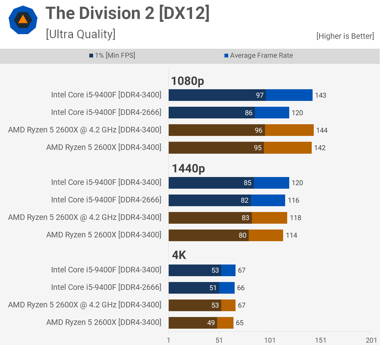 Enfin, nous avons The Division 2 et voici quelques résultats très intéressants sur lesquels terminer. En utilisant la mémoire DDR4-2666, le Core i5-9400F a atteint un maximum de 120 images par seconde en moyenne, avec un minimum de 1% des 86 images par seconde. Ensuite, la mémoire DDR4-3400 plus rapide a augmenté le taux de trame moyen de près de 20%, ce qui est assez significatif.