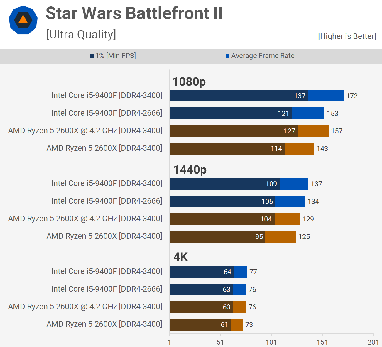 Malgré une bonne performance dans Battlefield V, le Ryzen 5 2600X n’est pas aussi agile dans Star Wars Battlefront II malgré les deux jeux utilisant le moteur de jeu Frostbite. La 2600X est inférieure à la 9400F même à 1440p, bien que les marges une fois ajustées soient minimales.