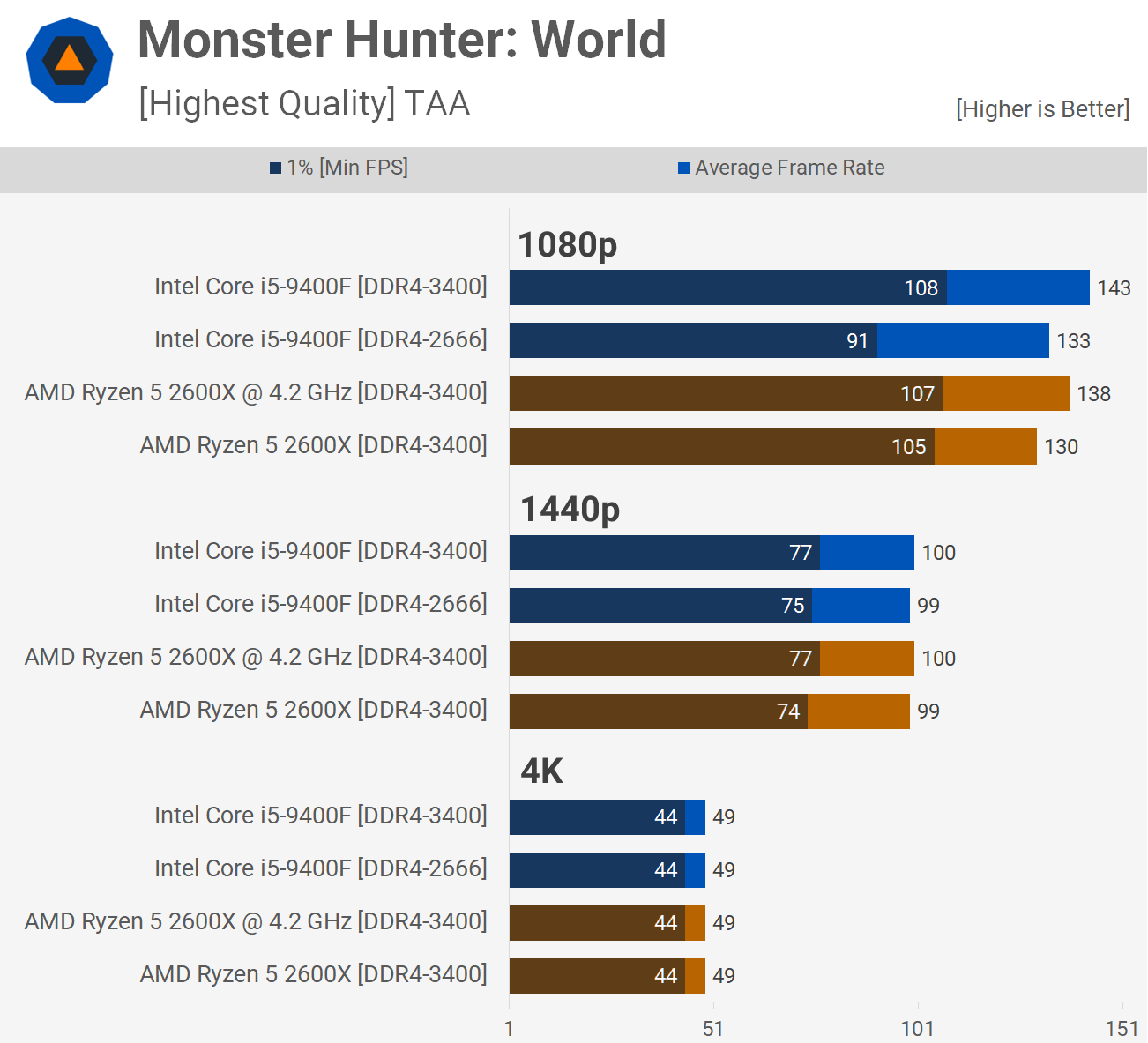En utilisant la mémoire DDR4-2666, le 9400F était un peu nerveux dans Monster Hunter: World, bien que cela ait été résolu avec la mémoire plus rapide DDR4-3400. Le 2600X ne présentait aucun problème de ce type, bien qu'il n'ait été testé qu'avec la mémoire 3400 car ce processeur n'a aucune limitation de mémoire pour les chipsets des séries B et X classiques. Une fois que nous avons augmenté la résolution à 1440p, le RTX 2080 Ti est devenu le goulot d'étranglement.