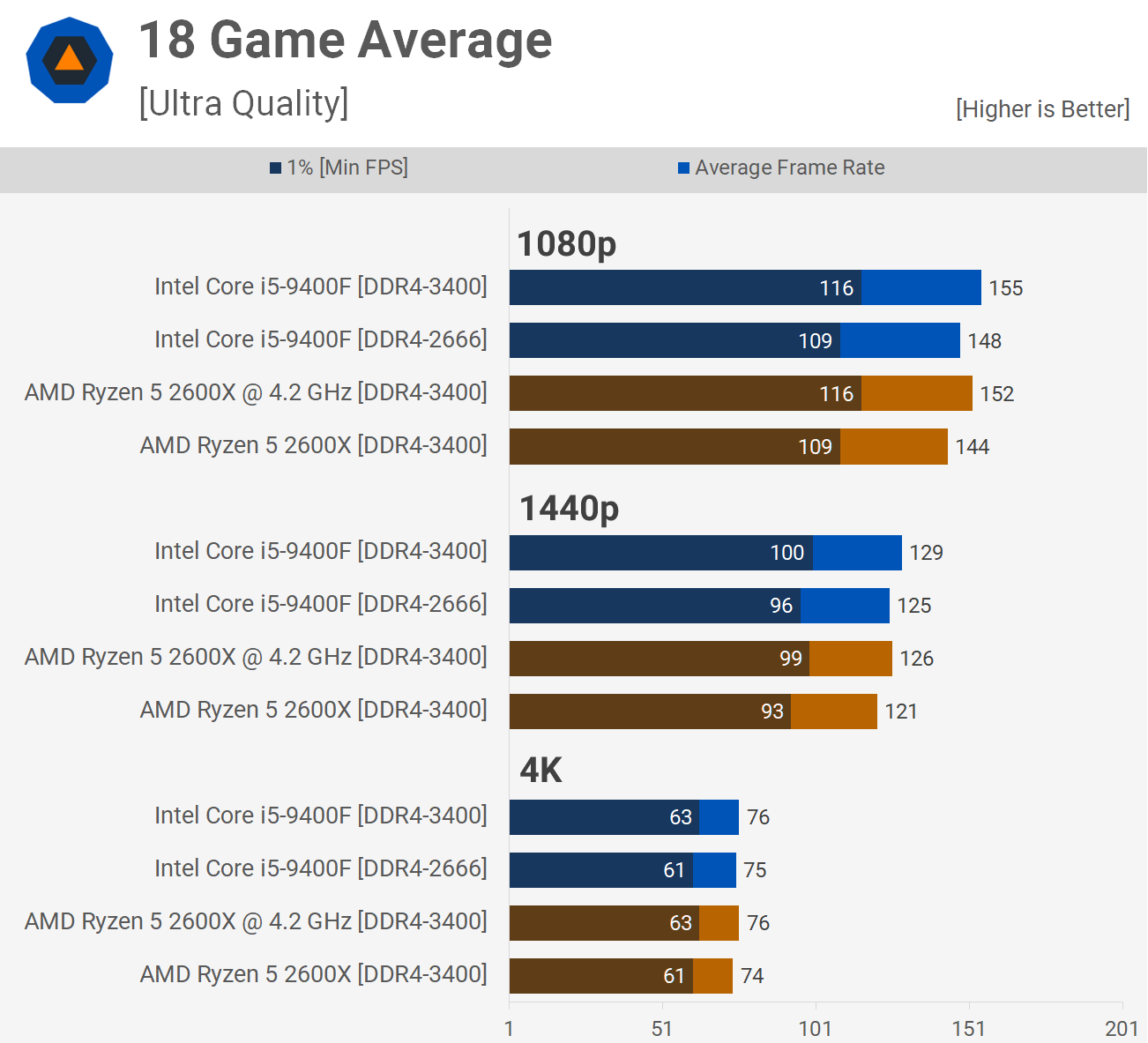 Des marges similaires ont été observées à 1440p, puis assez intéressant à 4K, le 2600X était un peu plus rapide, ou un peu plus rapide lorsqu'il était overclocké avec des timings de mémoire finement réglés. Vous vous attendez à ce que le résultat soit identique, comme nous, ou du moins devrait être limité à 100% par GPU, mais ce n’était pas le cas.