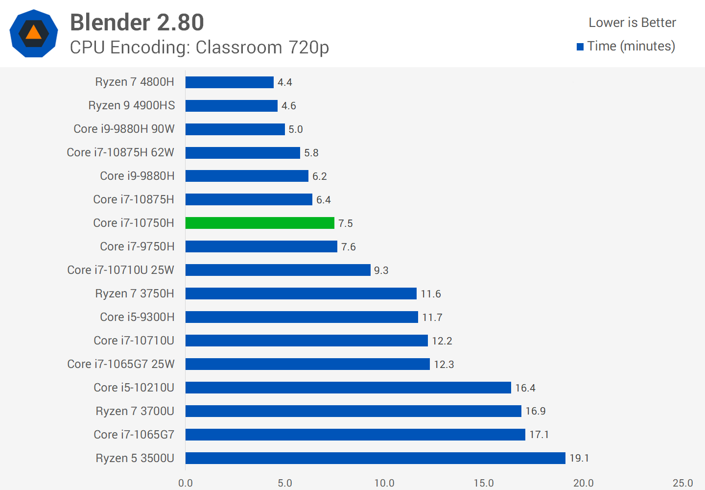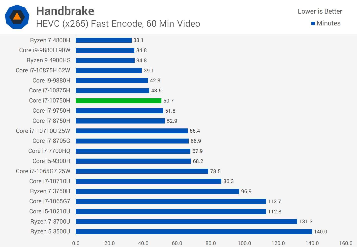 Dans une charge de travail à plus long terme comme Handbrake, nous ne voyons pas beaucoup d'amélioration en comparant le 10750H au 9750H. Ryzen détient une avance absolue sur le Core i7 le plus populaire d'Intel, terminant ce transcodage x265 plus de 50% plus rapidement.