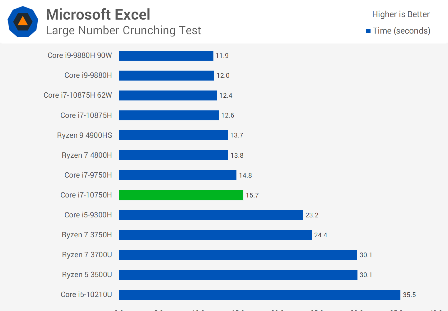 Microsoft Excel était une charge de travail où le 10750H se retrouvait un peu derrière le 9750H en moyenne sur les ordinateurs portables que nous avons testés. Quelques variations dans le comportement de boost seront à l'origine de cela. Comme Excel est principalement multi-thread, les performances sont en retard sur les 10875H et 4800H par des marges à deux chiffres.