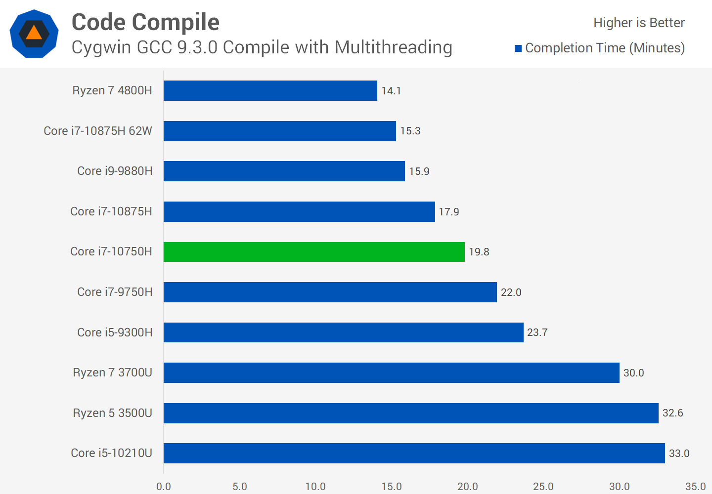 La compilation de code a été l'un des meilleurs résultats que nous ayons vus pour le 10750H. Dans cette compilation GCC, qui est un mélange de sections simples et multithreads, le 10750H s'est retrouvé à 10% devant le 9750H, une combinaison de vitesses de boost et d'horloge plus élevées dans certaines situations. Cependant, il perd toujours facilement le Ryzen 7 4800H, qui est plus rapide pour les charges de travail à la fois multiples et légèrement filetées dans la plupart des cas.