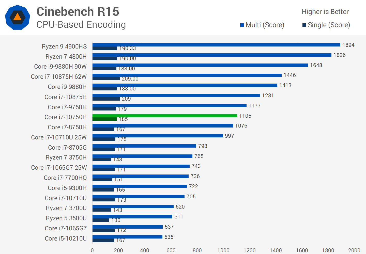 Parce qu'Intel a continué à offrir des performances de deux ans au même prix, AMD a pu pénétrer et secouer le marché des ordinateurs portables avec un processeur beaucoup plus rapide dans cette catégorie. Le Ryzen 7 4800H est, pour la plupart, des pourcentages à deux chiffres plus rapides avec la même consommation d'énergie et ce fil peut être de 50% ou plus lorsqu'il est alimenté par une charge de travail qui peut utiliser l'ensemble de ses 8 cœurs.
