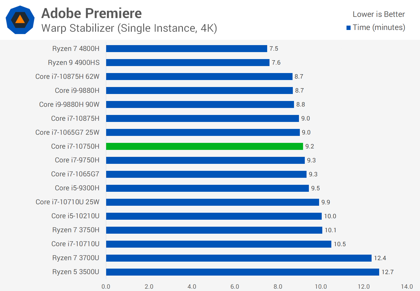 Et enfin, nous avons l'effet Warp Stabilizer, qui est légèrement fileté. Aucun gain de performances par rapport au Core i7-9750H, et comme nous en avons parlé dans apparemment tous les benchmarks de cette vidéo, il ne peut tout simplement pas suivre le Ryzen 7 4800H dans ce test. Lors de l'exécution d'une seule instance de stabilisateur de chaîne, le 4800H était 22% plus rapide.