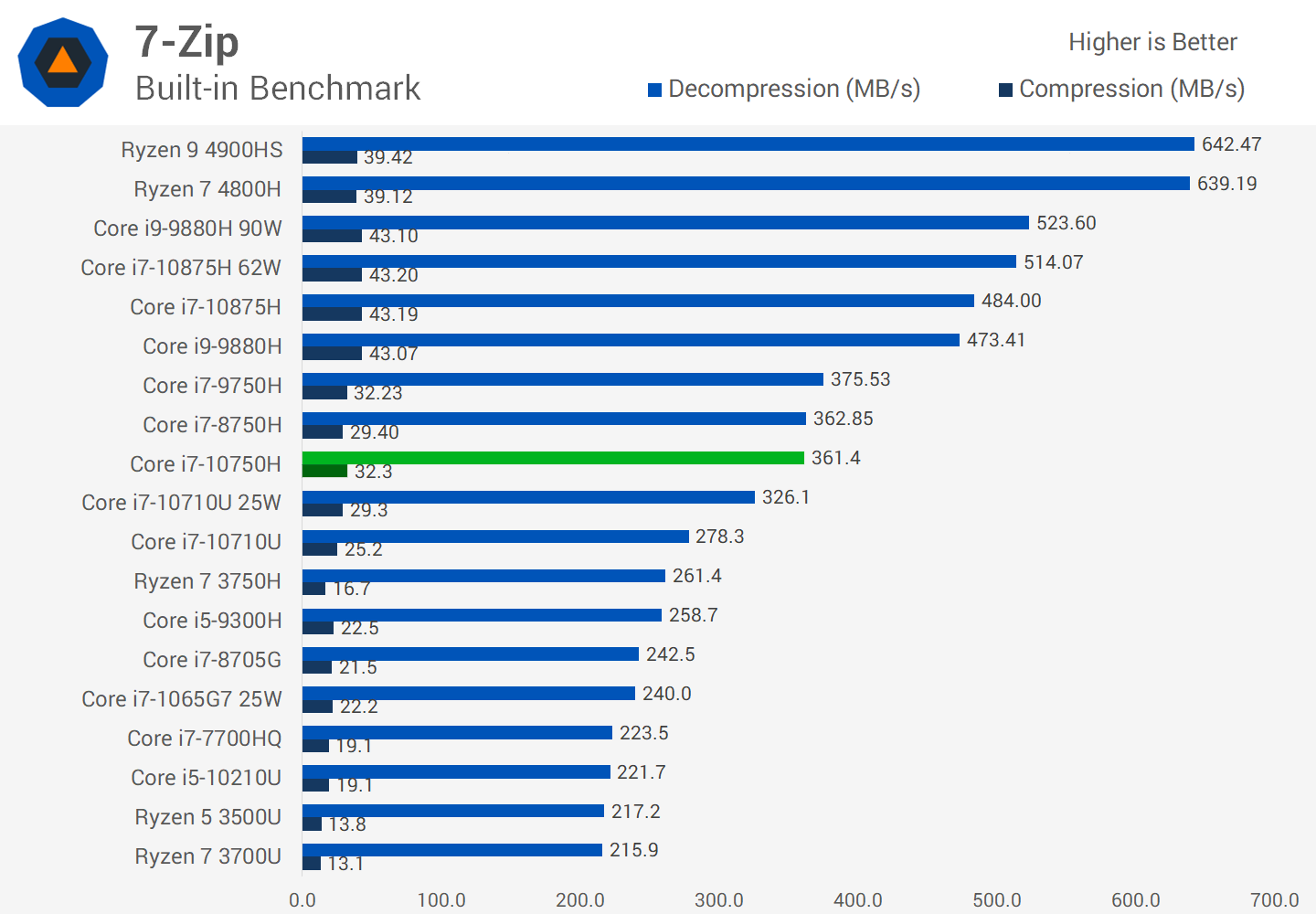 7-Zip montre que les performances sont très similaires entre les 10750H, 9750H et 8750H, pas grand-chose ici. Comme ce test est multi-thread, les performances sont un peu derrière le processeur 8 cœurs 10875H d'Intel, jusqu'à 25% plus lent, et également derrière Ryzen 7 4800H.
