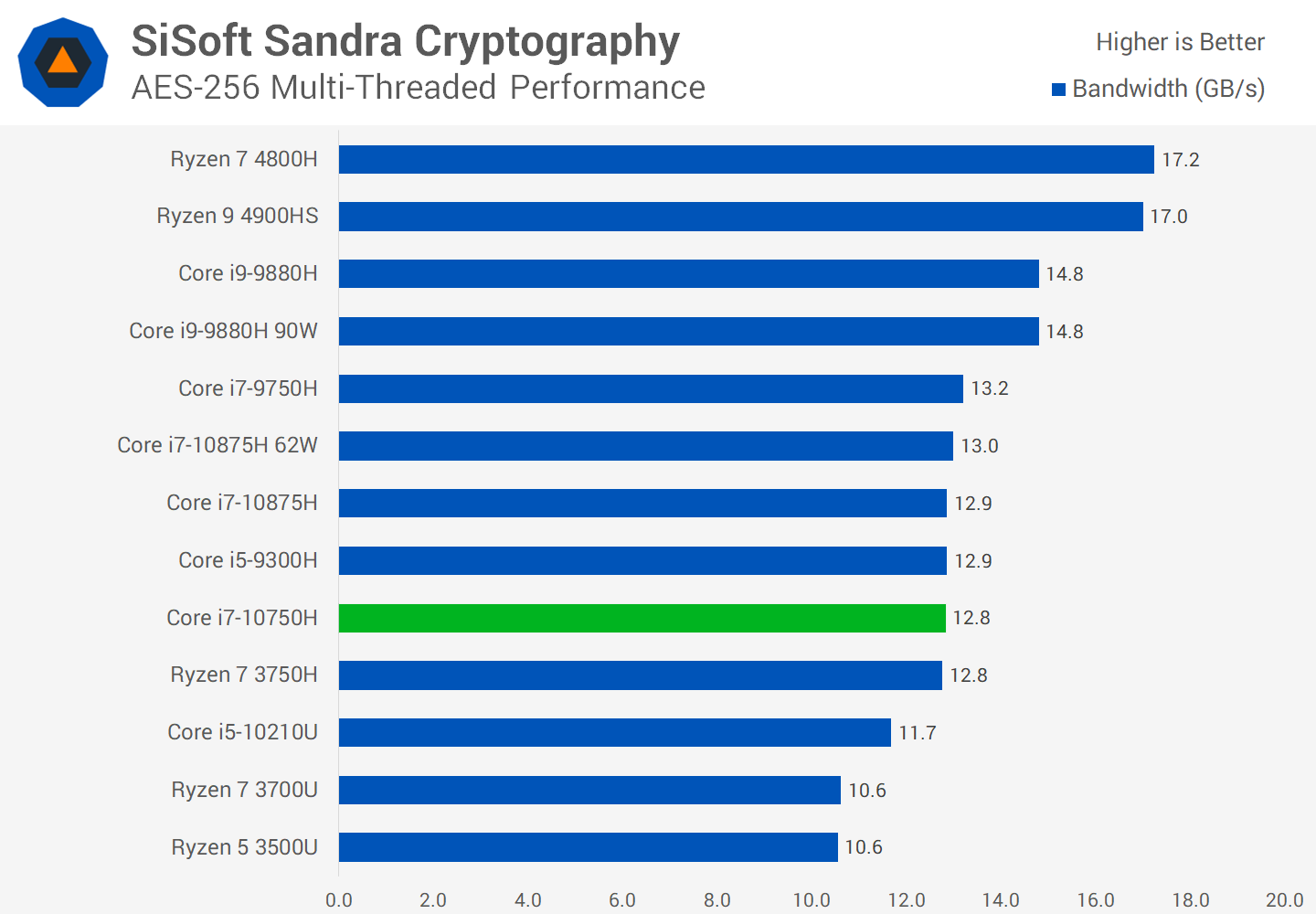 Dans les performances AES, encore une fois, nous ne voyons pas beaucoup de différence entre le 9750H et le 10750H, ni même le 10875H. En effet, il s'agit d'une fonction matérielle accélérée et il ne semble pas y avoir de gain ici, probablement car l'architecture est la même. La cryptographie est un autre domaine où Ryzen est beaucoup plus rapide dans les ordinateurs portables, 35% plus rapide lorsqu'il est multi-thread.