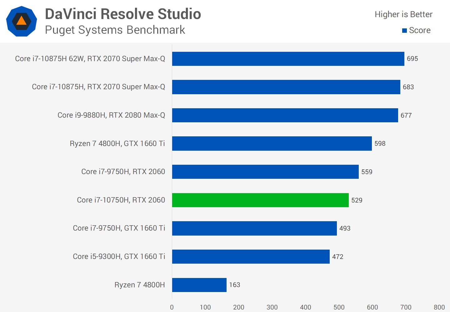 DaVinci Resolve Studio utilisant la charge de travail Puget est un autre exemple rare où notre configuration Core i7-10750H était plus lente que notre système Core i7-9750H avec le même GPU RTX 2060. Ce n'était pas massivement plus lent, mais c'était plus lent dans l'ensemble, ce qui est un résultat étrange. Néanmoins, les deux options de processeur ont pris du retard sur le Ryzen 7 4800H, ce qui est typique des applications d'encodage vidéo.