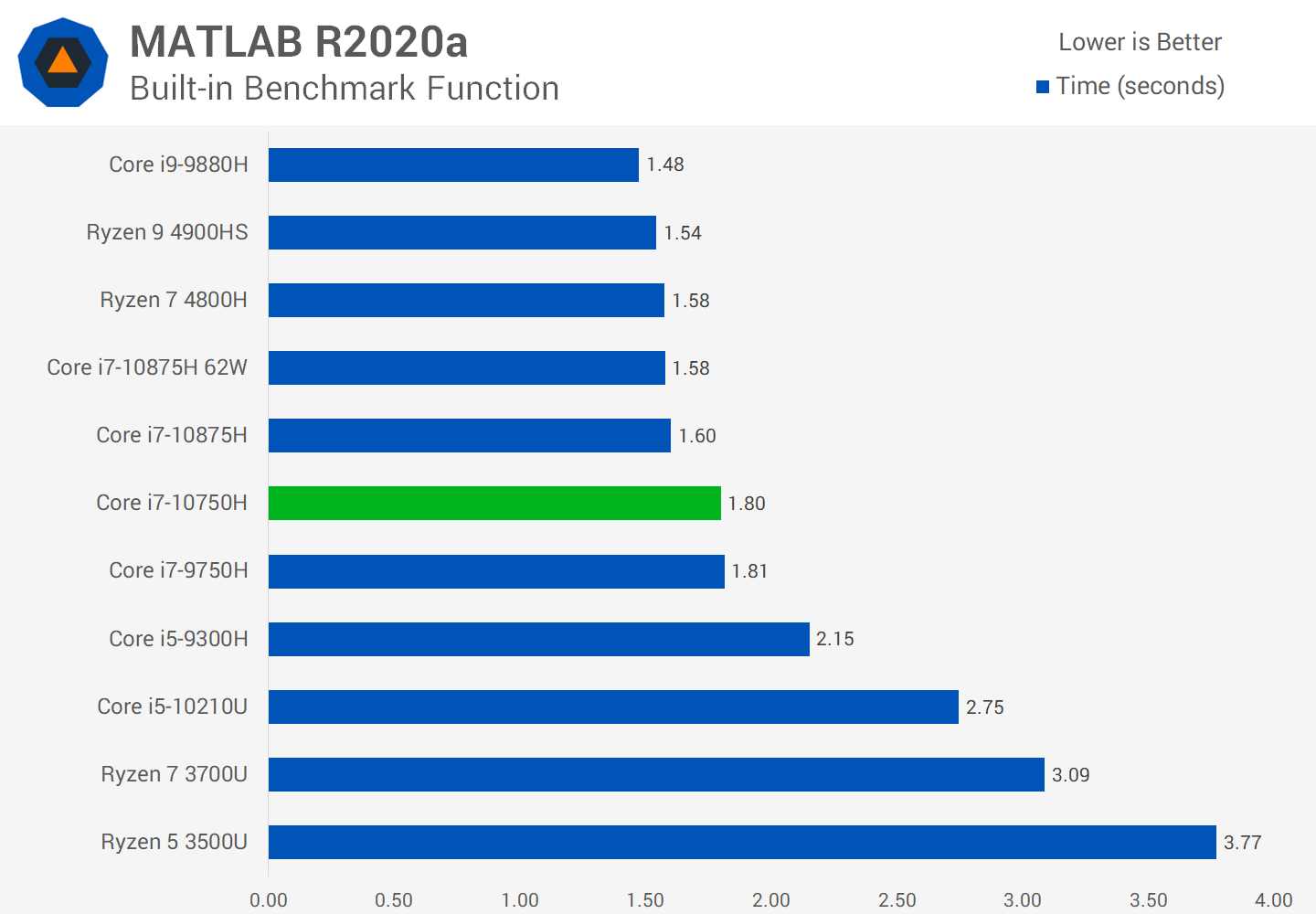 MATLAB ne montre aucun gain de performances réel pour le 10750H par rapport au 9750H, et comme les autres tests que nous venons de voir, il est plus lent que 8 options de processeur de base avec une marge à deux chiffres. Compte tenu des résultats de Ryzen 7, les six cœurs à ce prix semblent un peu datés.