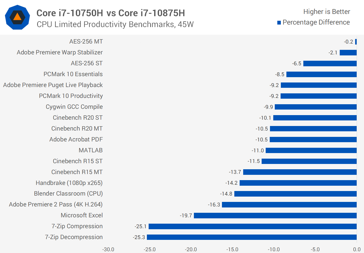 Dans Cinebench R20, le 10750H fonctionne presque exactement comme un Core i7-9750H, qui lui-même fonctionne comme un Core i7-8750H. Ces deux processeurs de dernière génération ont cadencé autour de 3,1 GHz à long terme sur six cœurs dans la limite de puissance de 45 W. Le 10750H finit par cadencer autour de 3,2 GHz à long terme, donc une augmentation de 100 MHz dans ce cas. Avec cela équivalant à un gain de vitesse d'horloge de 3%, il n'est pas surprenant que nous ayons souvent constaté des améliorations des performances multicœurs dans la plage de 2 à 3%, ce qui est négligeable.