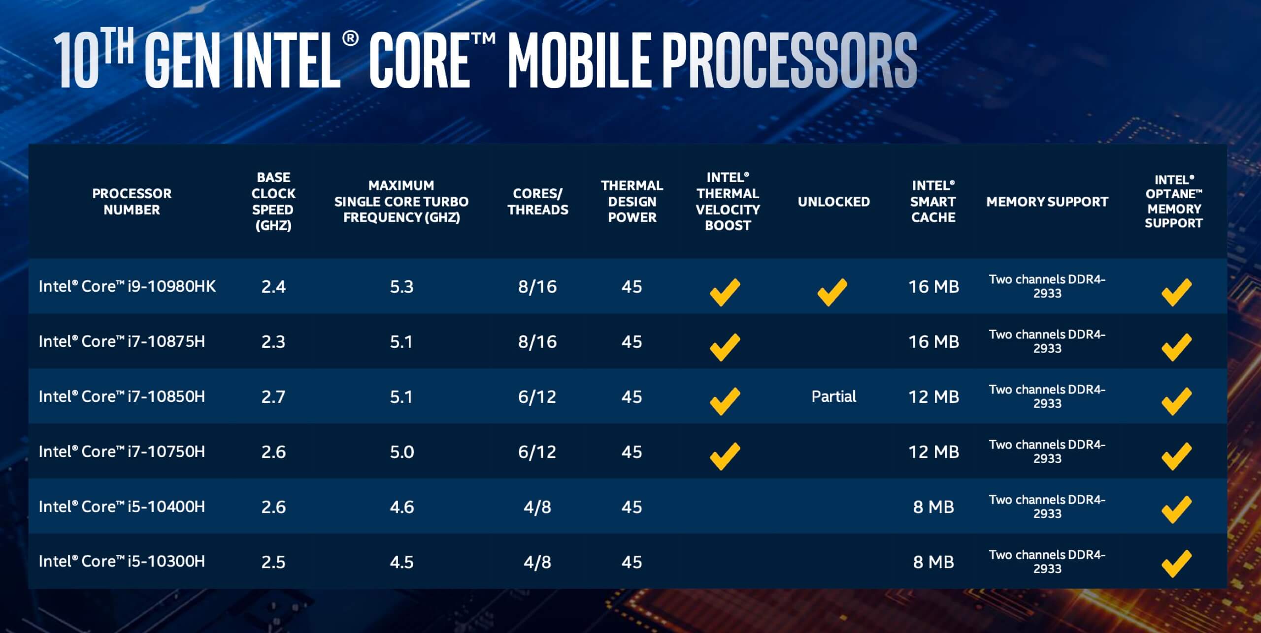 Ce n'est pas le seul processeur Core i7 de la gamme Intel Comet Lake. Il y a quelques autres options, y compris le nouveau Core i7-10875H à 8 cœurs que nous avons examiné il y a quelques semaines, mais à en juger par les générations précédentes, tout ce qui dépasse le 10750H sera généralement limité aux options premium, tandis que les Core i5 que vous voyez ici – qui sont étonnamment encore des cœurs quad – sont destinés aux conceptions d'entrée de gamme les plus basiques.