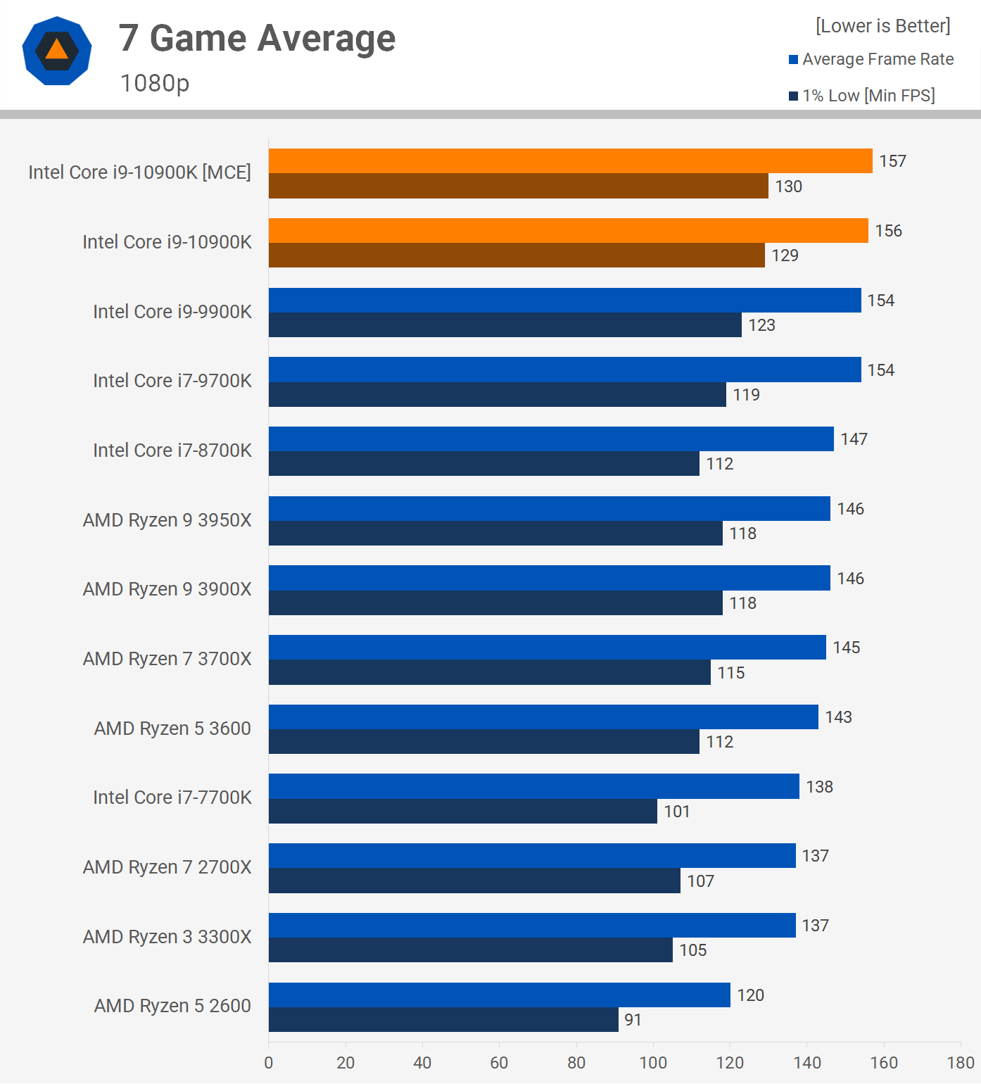 Voyons la moyenne des sept matchs. Compte tenu de ce que nous venons de voir, cela ne vous surprendra pas d'apprendre qu'en moyenne, le 10900K est 7% plus rapide que le 3900X. Ce n'est pas une grande marge en 1080p lorsque vous utilisez un RTX 2080 Ti, mais cela signifie qu'Intel conserve la couronne de performances de jeu.
