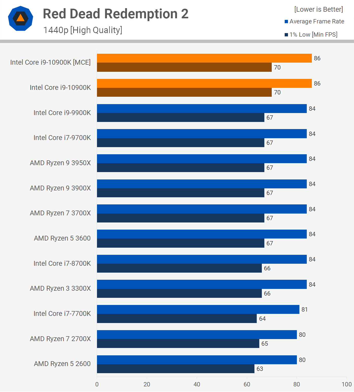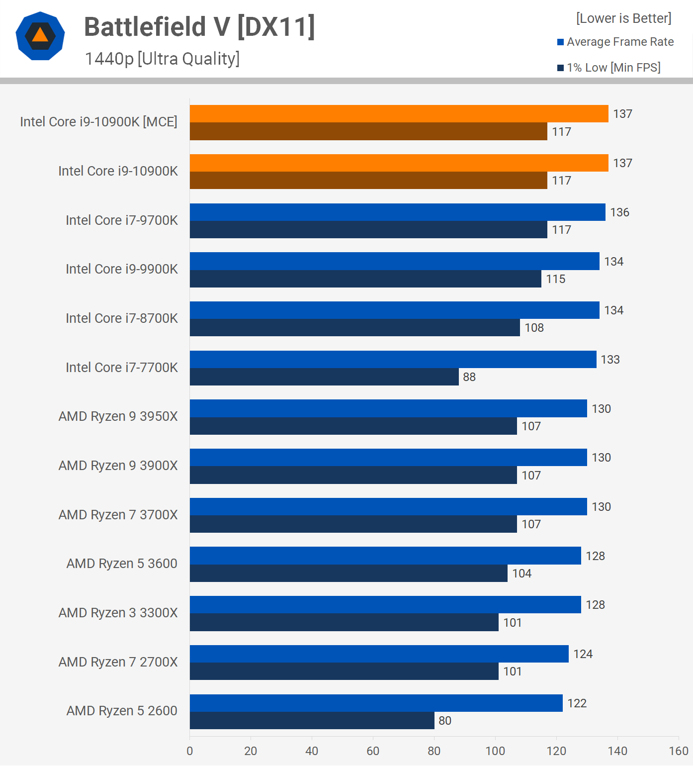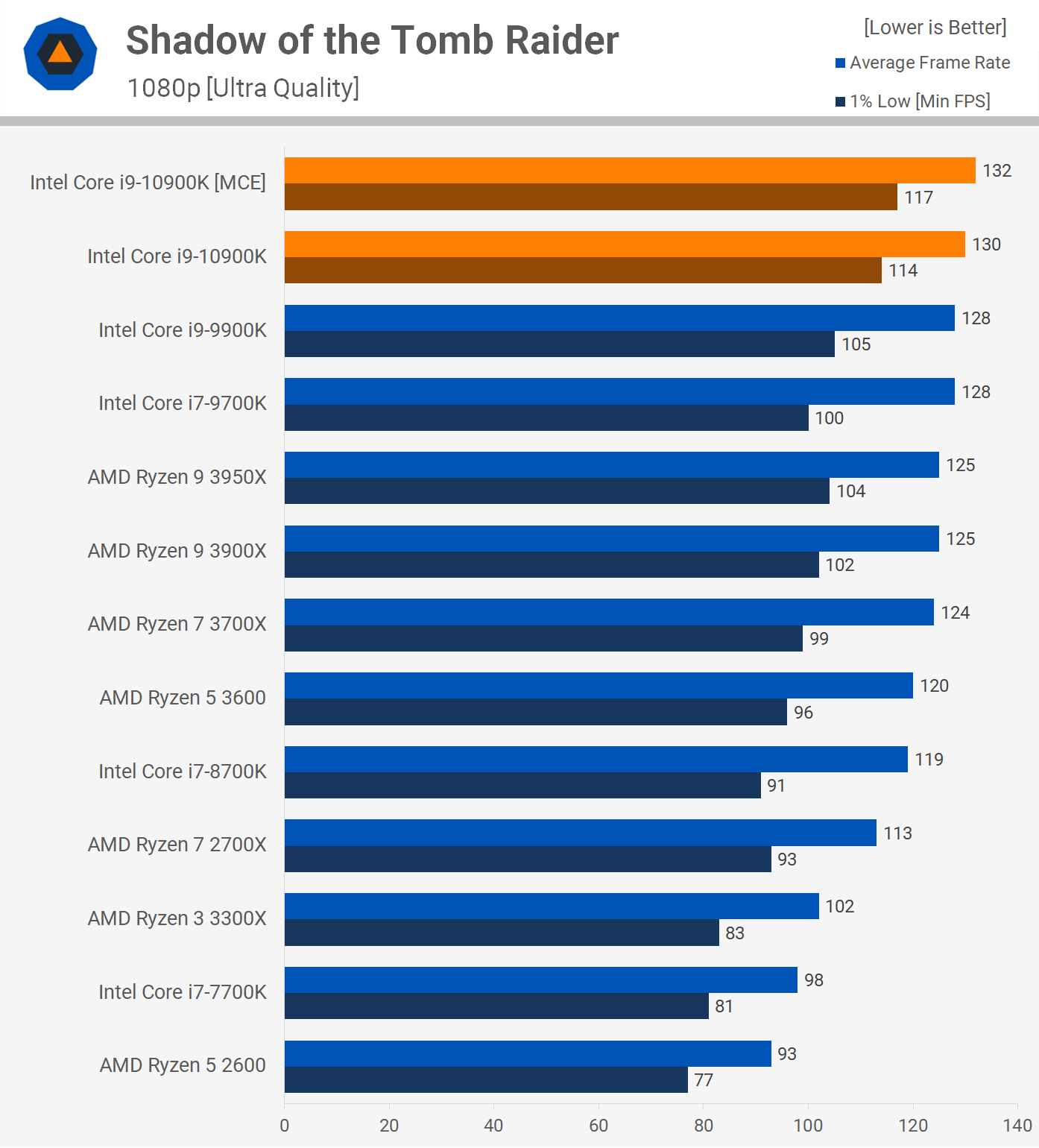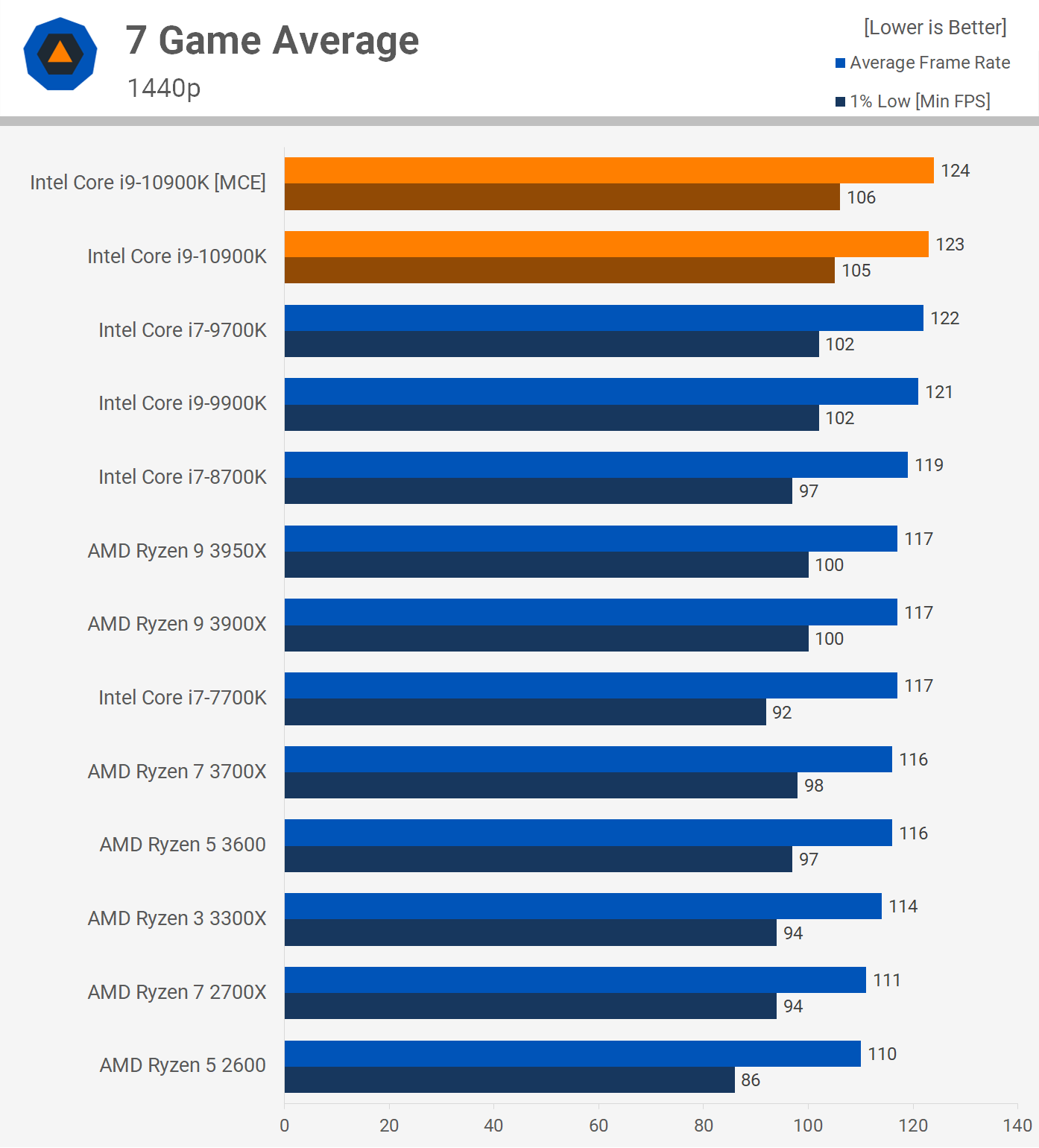 La même chose est observée à 1440p, bien que les performances monocœur légèrement plus élevées du 10900K semblent lui donner un petit avantage, bien que nous ne prenions qu'un coup de pouce de 2% par rapport au 9900K.