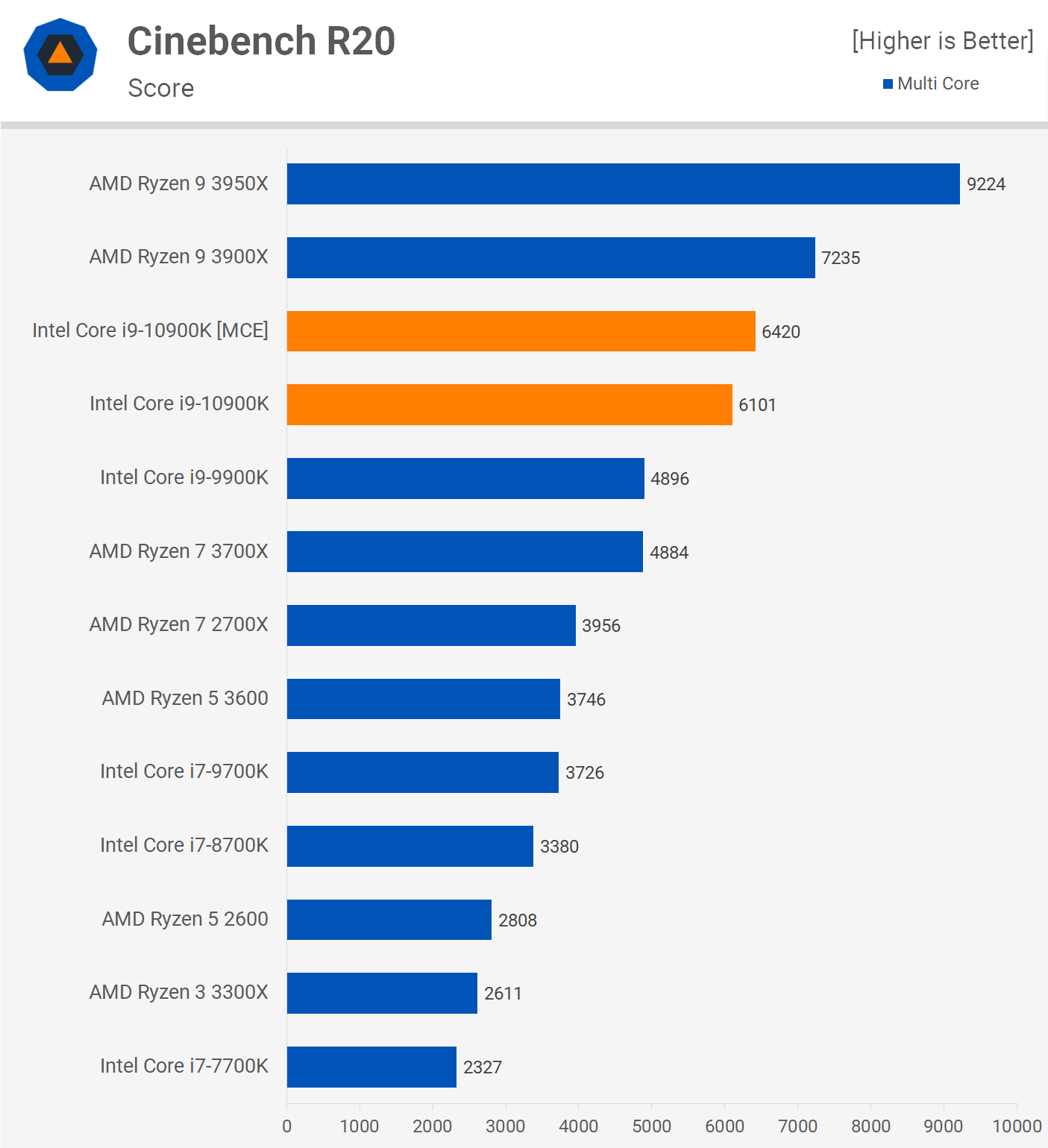 Nous avons testé le 10900K dans deux configurations: l'une est une configuration d'origine avec le profil XMP chargé qui voit le paramètre d'amélioration multicœur désactivé par défaut, comme il se doit. Le deuxième résultat qui a été étiqueté «MCE» présente une amélioration multicœur activée, il s'agit essentiellement d'une configuration overclockée, comme l'activation du PBO sur un processeur AMD Ryzen, par exemple.