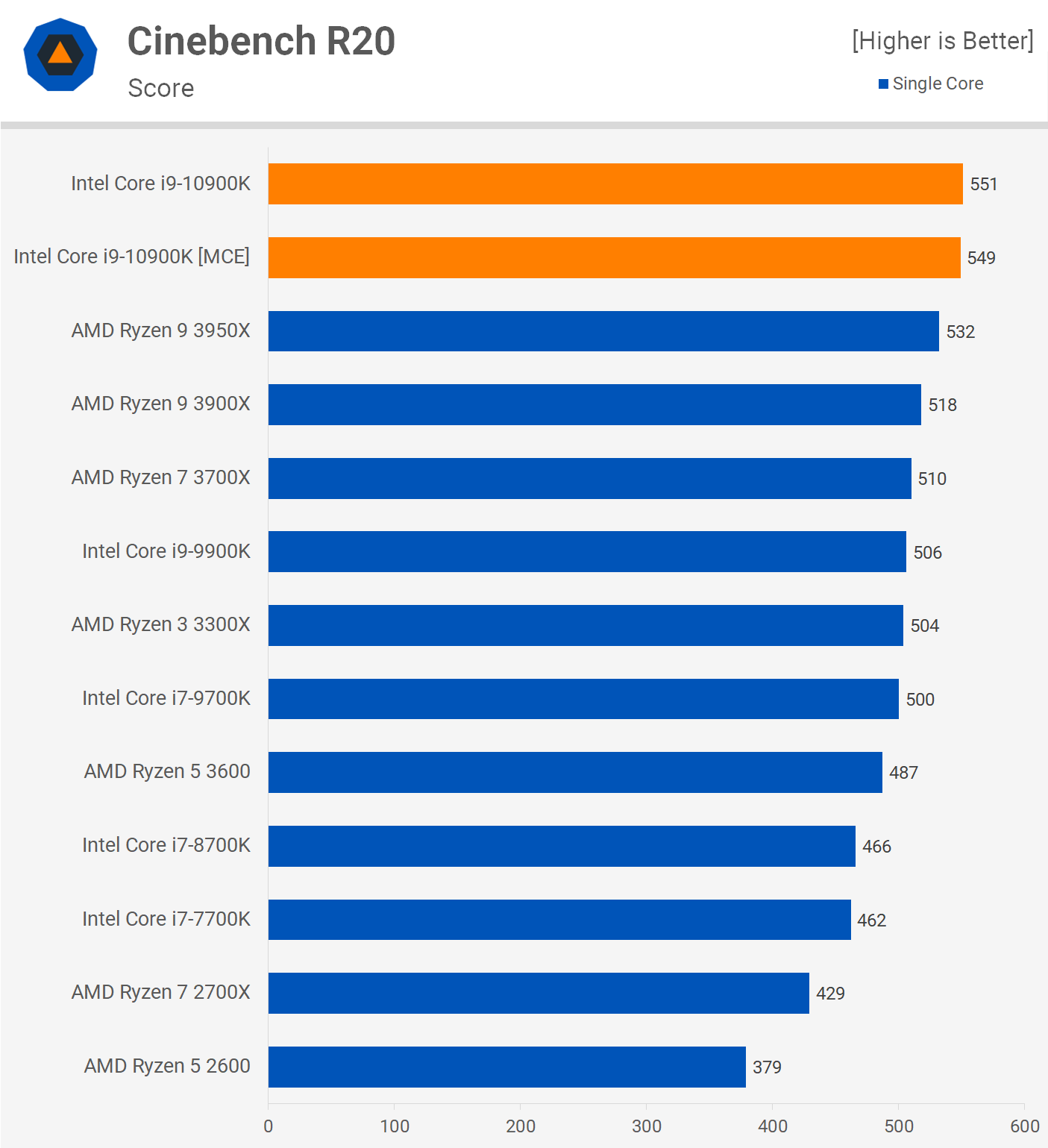 Le 10900K est très solide en performances monocœur, grâce à cette fréquence d'horloge de 5,3 GHz. Cela lui a permis de marquer un très impressionnant 549 pts, ce qui le rend 3% plus rapide que le 3950X et 6% plus rapide que le 3900X. Il s'agit également d'une amélioration de 8% par rapport au 9900K, qui dépasse 5 GHz.