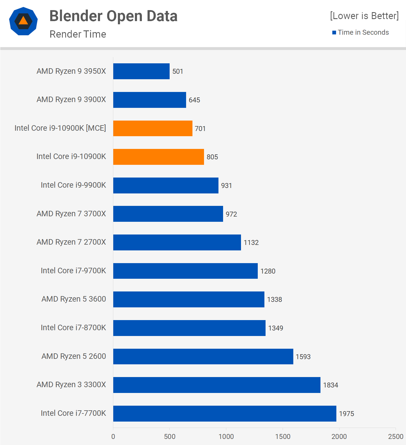 Le 10900K est à peine 16% plus rapide que le 9900K dans le benchmark Blender Open Data et cela le rendait 20% plus lent que le 3900X. Cependant, l'activation de MCE augmente considérablement les performances dans ce test, car la vitesse d'horloge tous cœurs passe de 4,3 GHz à 4,9 GHz, mais comme vous le verrez plus loin dans la revue, cela a un impact considérable sur la consommation d'énergie.