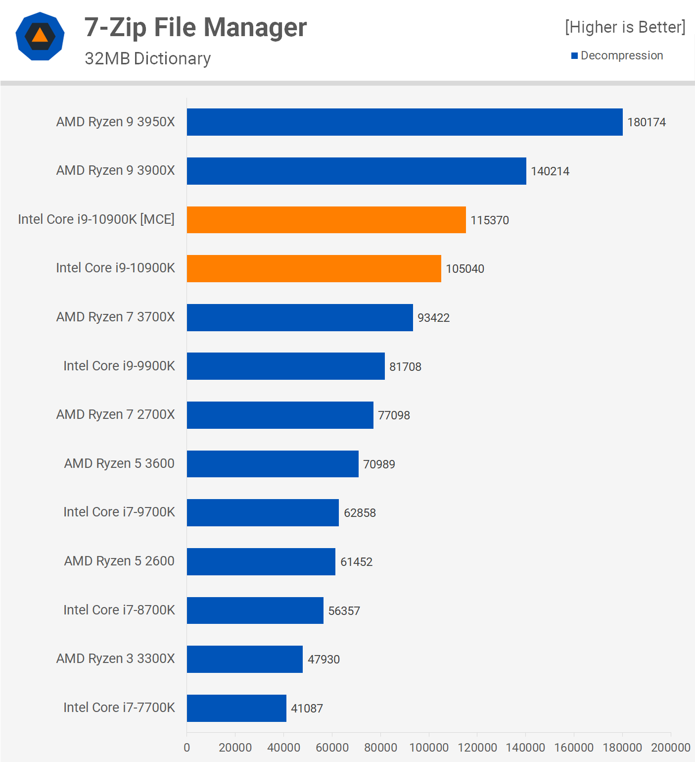 Les marges sont similaires en ce qui concerne les performances de décompression, le 10900K était ici 12% plus rapide que le 3700X mais 25% plus lent que le 3900X. Encore une fois, ce n'est pas un endroit idéal pour la nouvelle offre de bureau phare d'Intel.